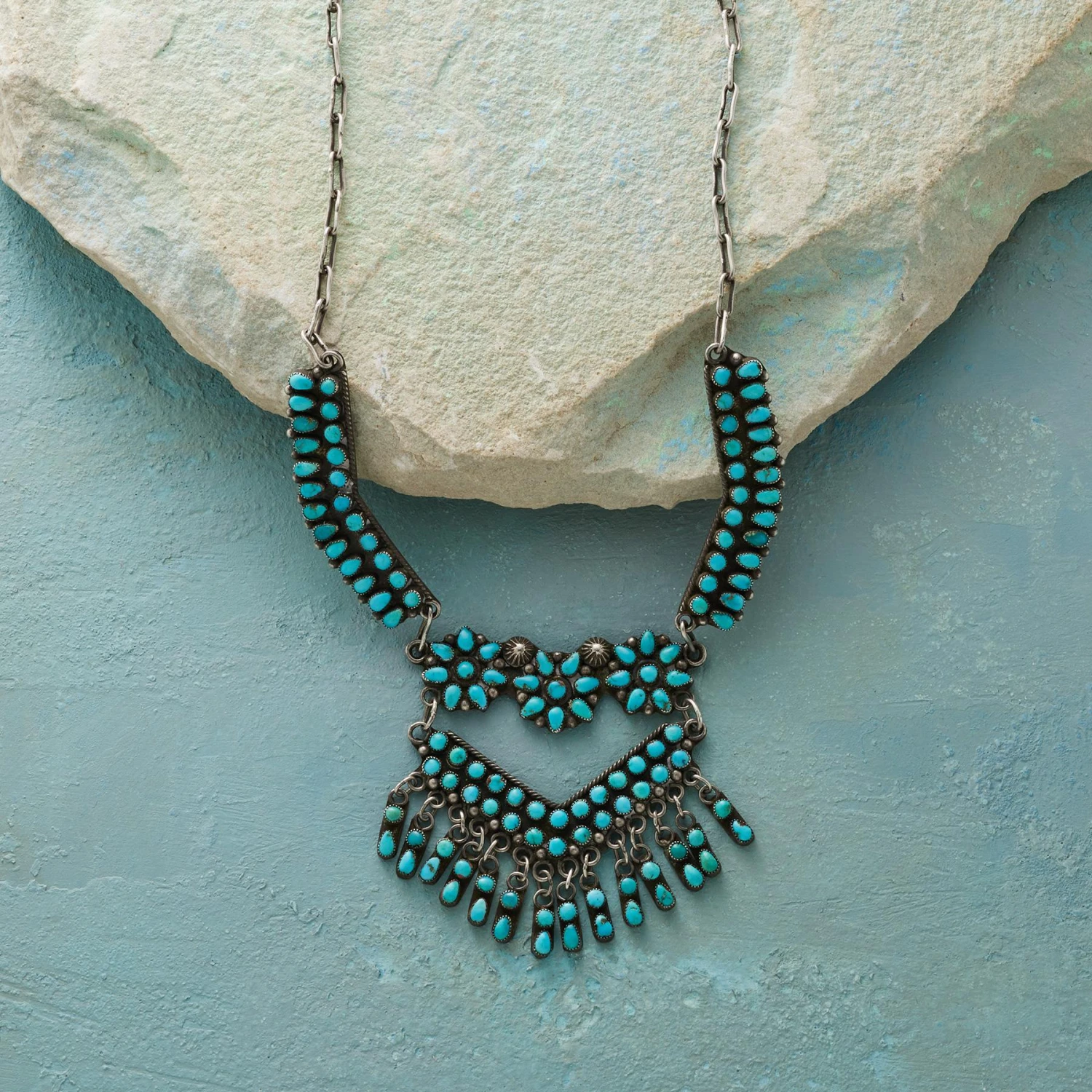 More than 100 pieces of Blue Gem turquoise, prized by collectors, is hand cut and placed in sawtooth bezels. The turquoise is artfully set in sterling collar pieces accented with bead balls, twisted wire and rosettes. A sterling chevron pendant fringed with turquoise and sterling paddles finishes this Zuni-made necklace. Sterling linked chain with hook-and-eye closure. One of a kind. Made in USA. Exclusive. Approx. 17″l, 2-1/2″ drop, sections 2-1/4″l.