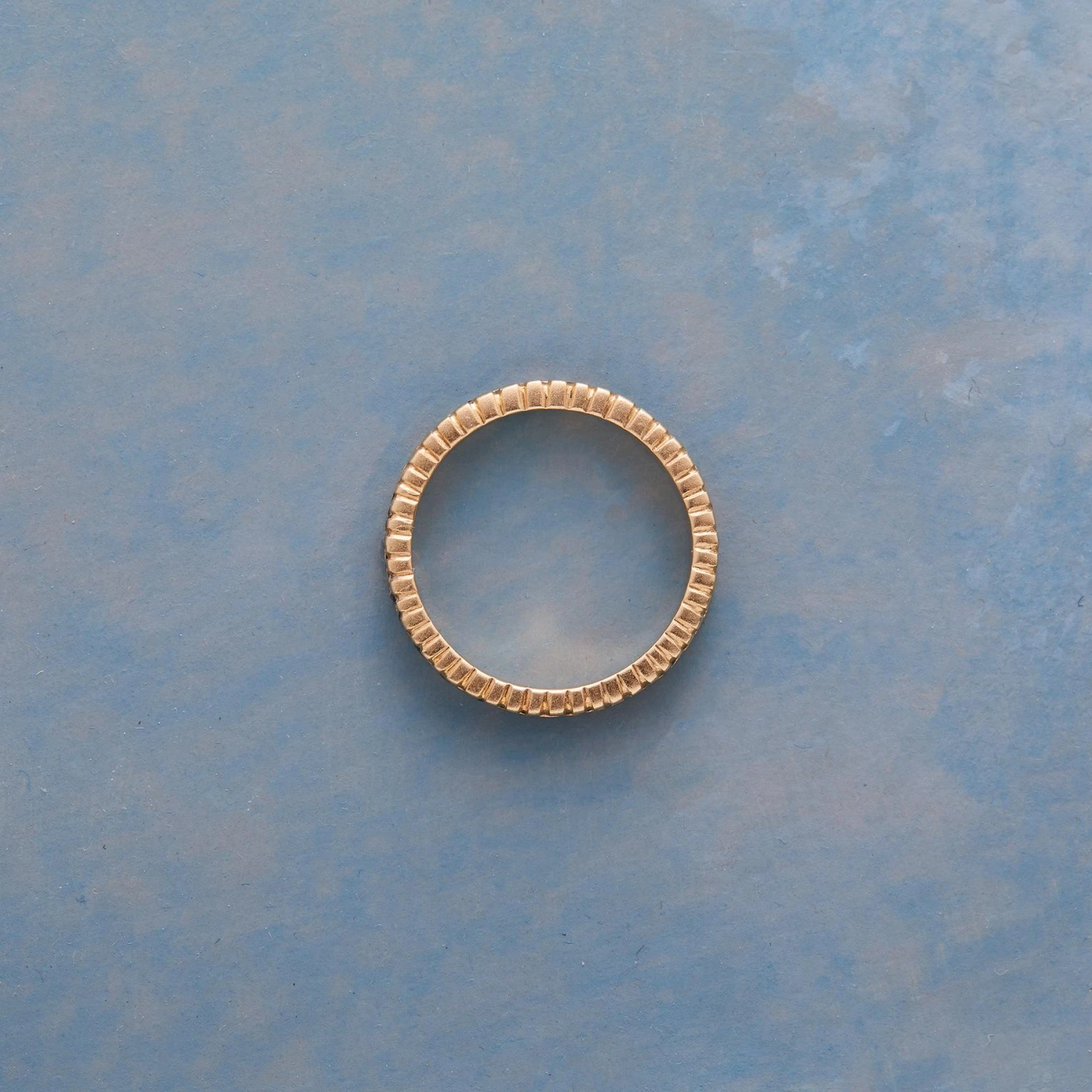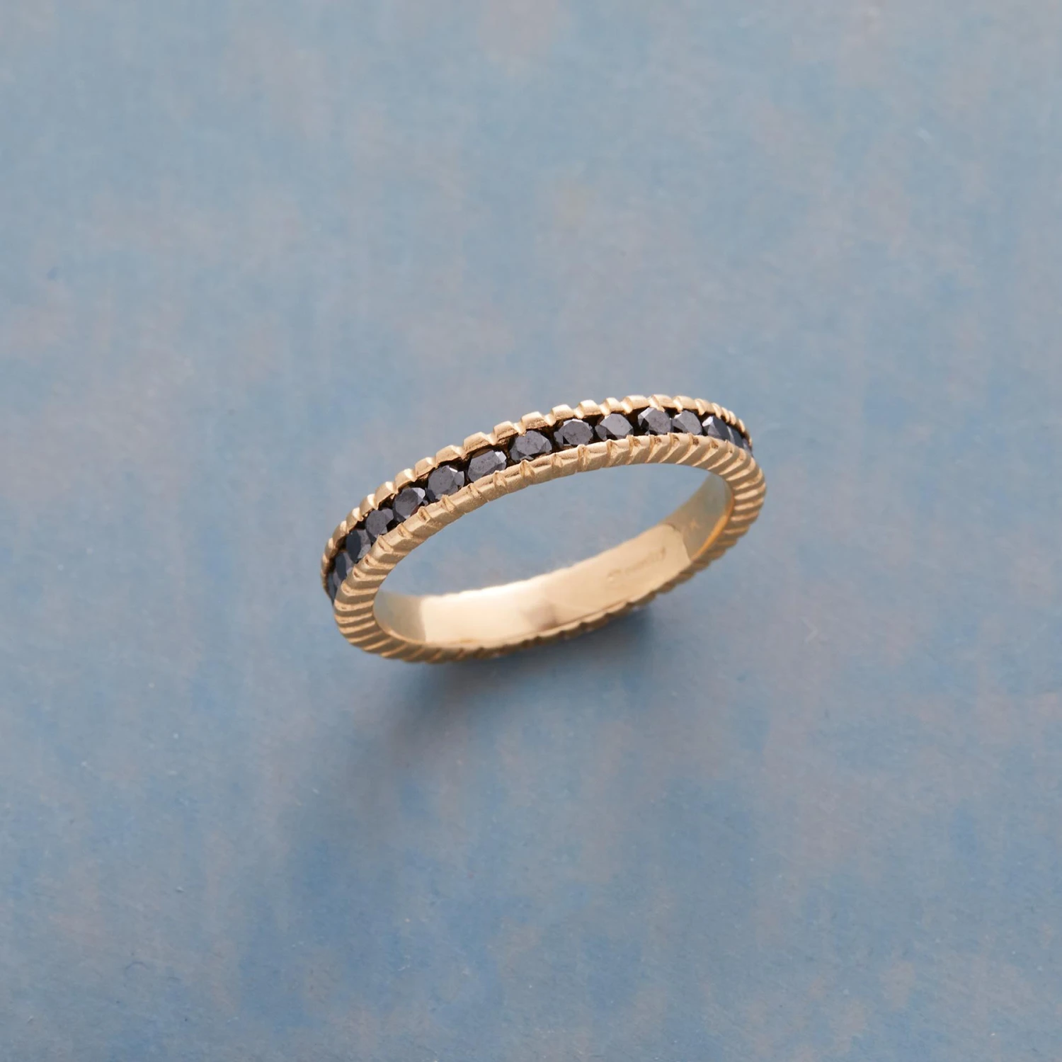 A never-ending procession of glistening black diamonds shimmers within a textured channel of satin-finished 14kt gold. By Shaesby Scott; handmade in USA. Whole sizes 5 to 9.