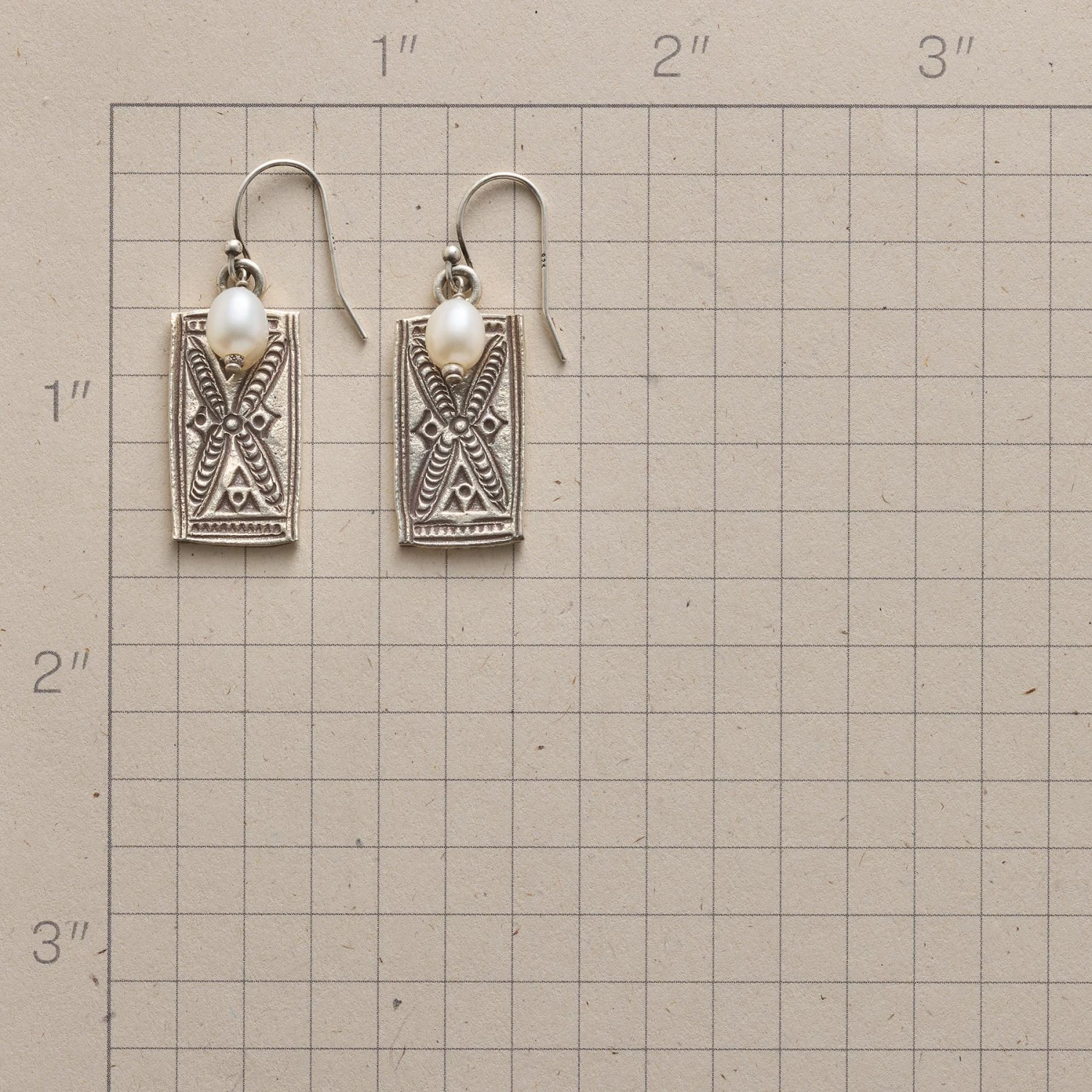 Oxidation emphasizes the pattern stamped into sterling silver tabs, an intricate backdrop for a cultured pearl. Exclusive. Handmade. French wires. 1-1/2″L.