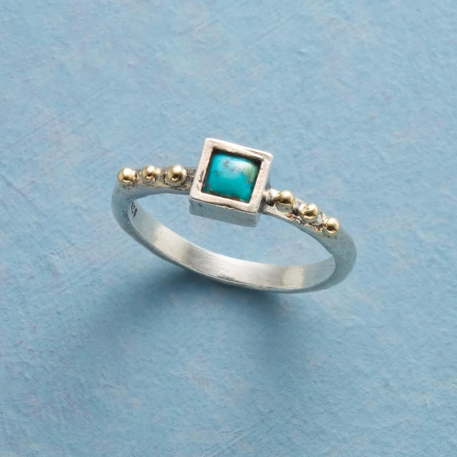 Flanked by trios of gilded balls, a deep square setting holds stabilized turquoise like a skylight frames the sky. Sterling silver and 14kt gold. Handcrafted. Exclusive. Whole sizes 5 to 9.