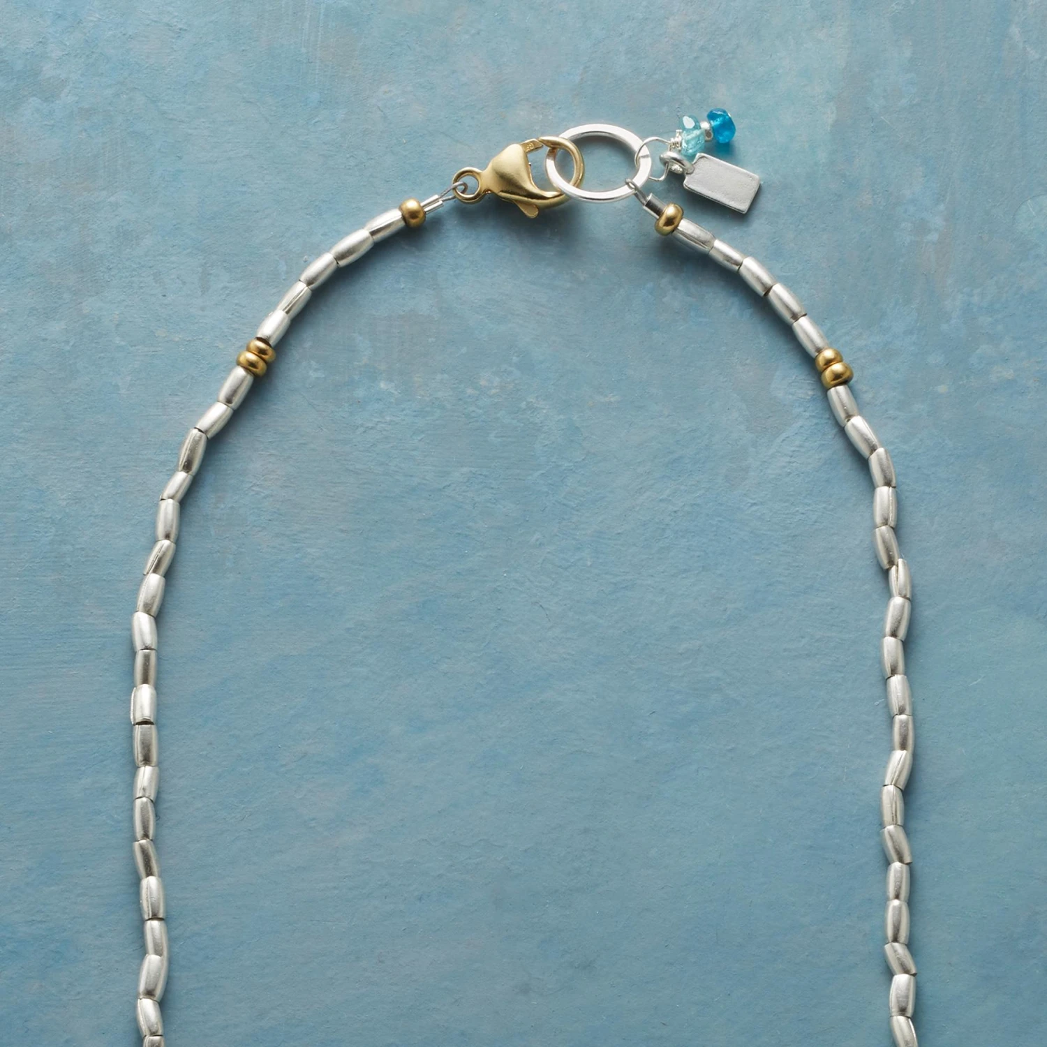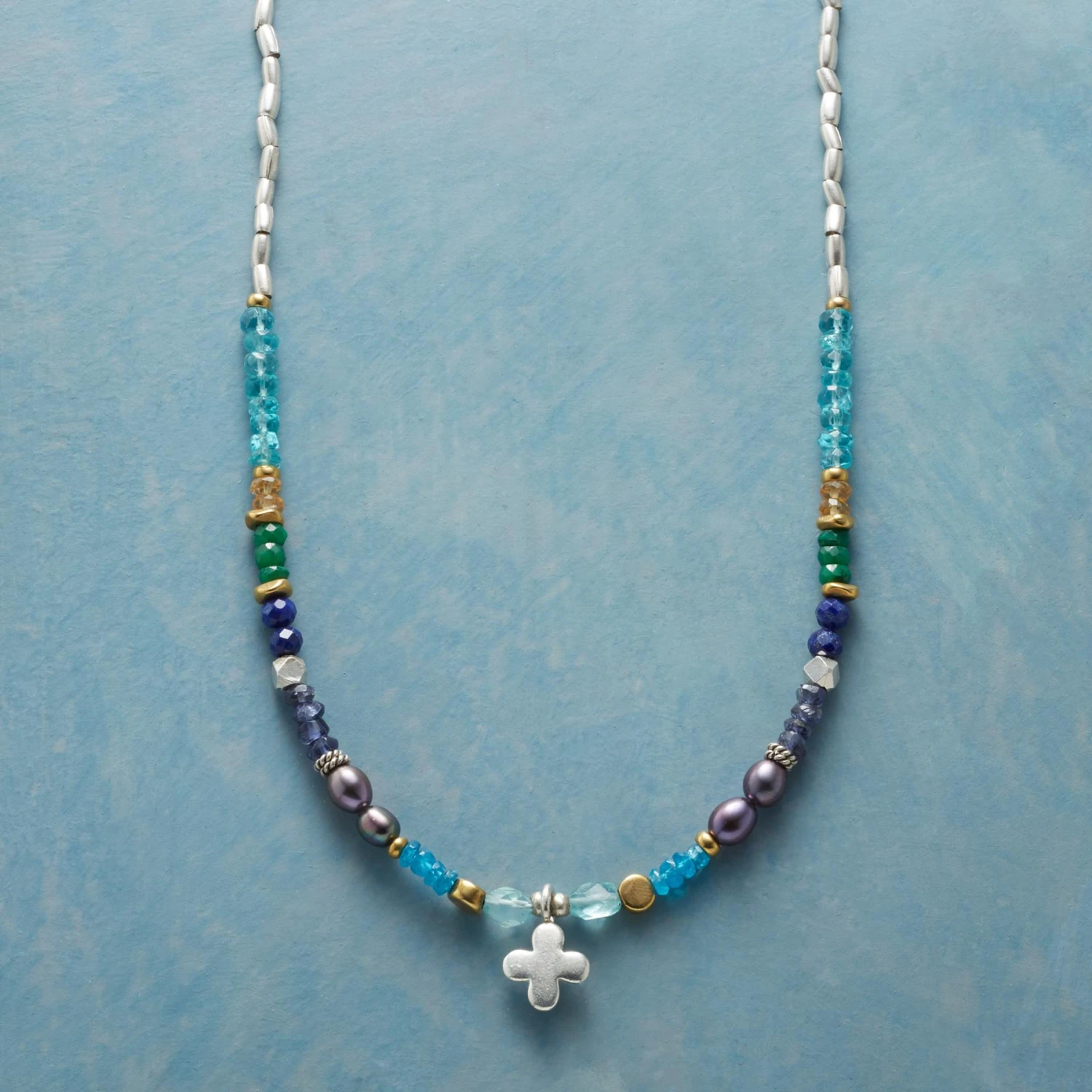 A cross marks the center amid gems and sterling silver beads. With apatite, iolite, emerald, citrine, lapis and cultured pearls. Brass accents. 14kt gold filled lobster clasp. Exclusive. Handmade in USA. 17″L.