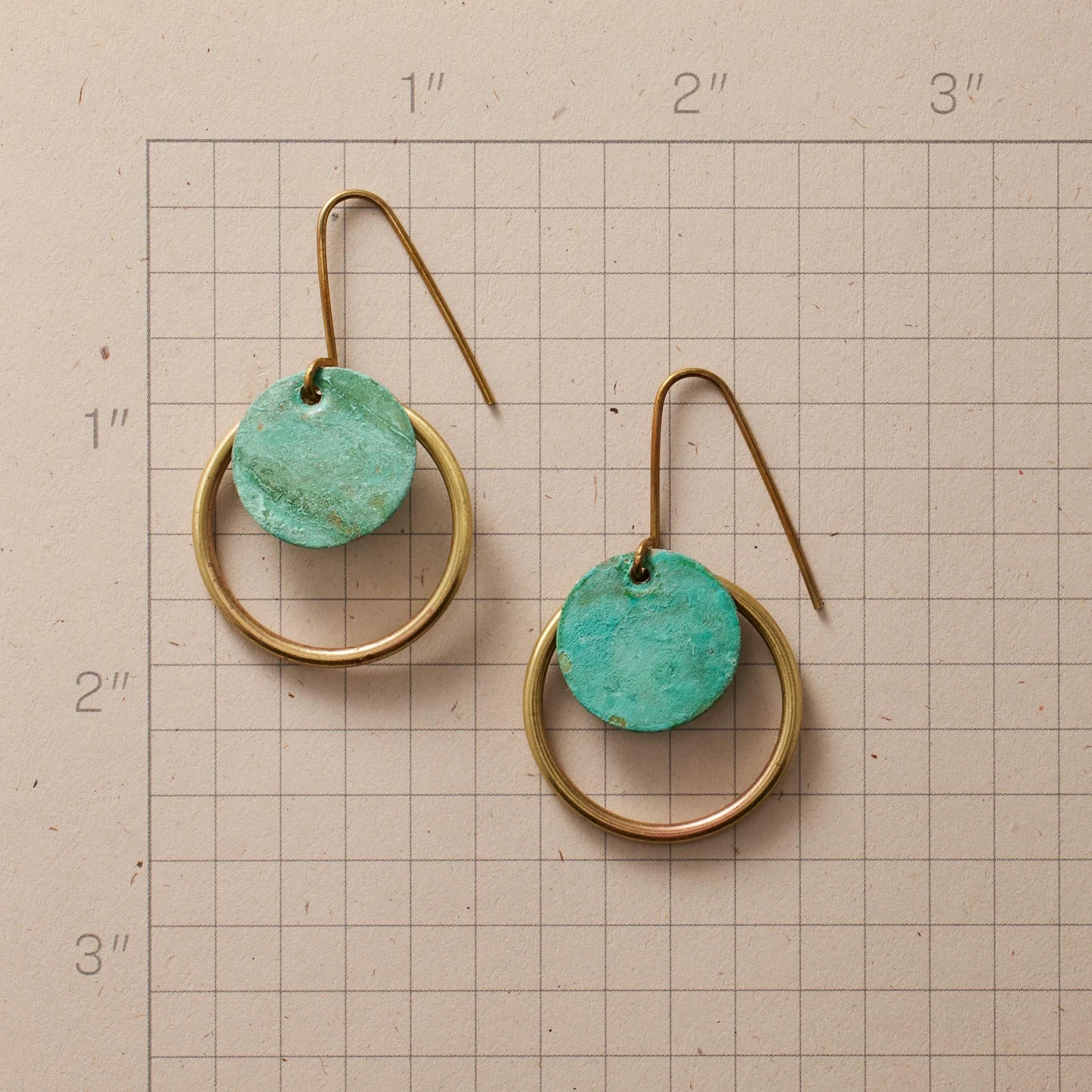 Polished and patinaed brass contrast and complement each other as they swing from brass French wires. Handcrafted. 1-1/2″L.