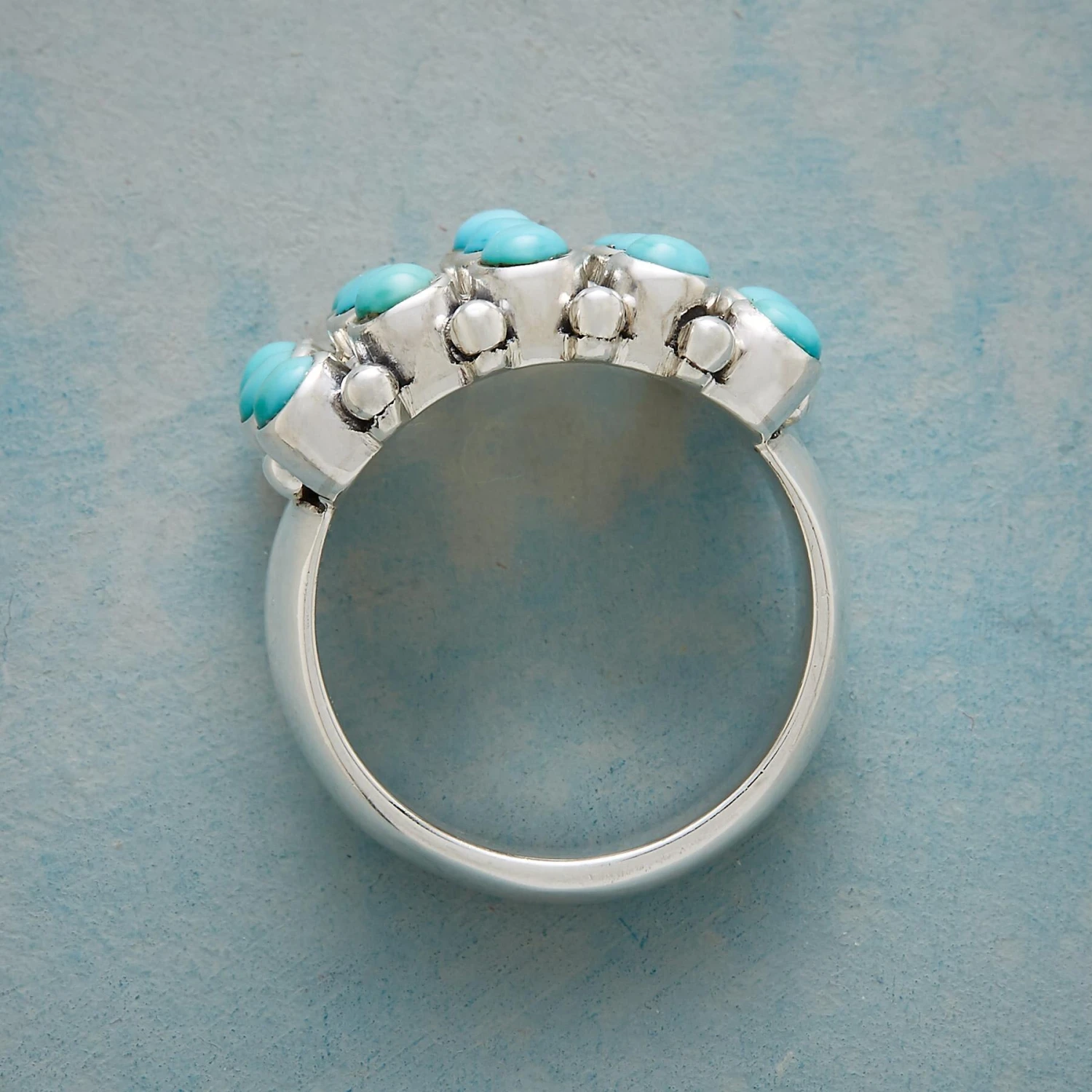 Bright and bubbly, our ring intersperses rows of compressed turquoise with polished sterling silver balls. Set on a wide, half-round sterling band, the grid of stones curves to hug the finger. Handcrafted. Exclusive. Whole sizes 5-11.