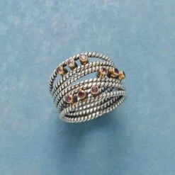 Seven garnets in two sizes keep time ’round this sterling silver ring. Designed to shine alone or stacked with other favorites. Handcrafted. Whole sizes 5-10.