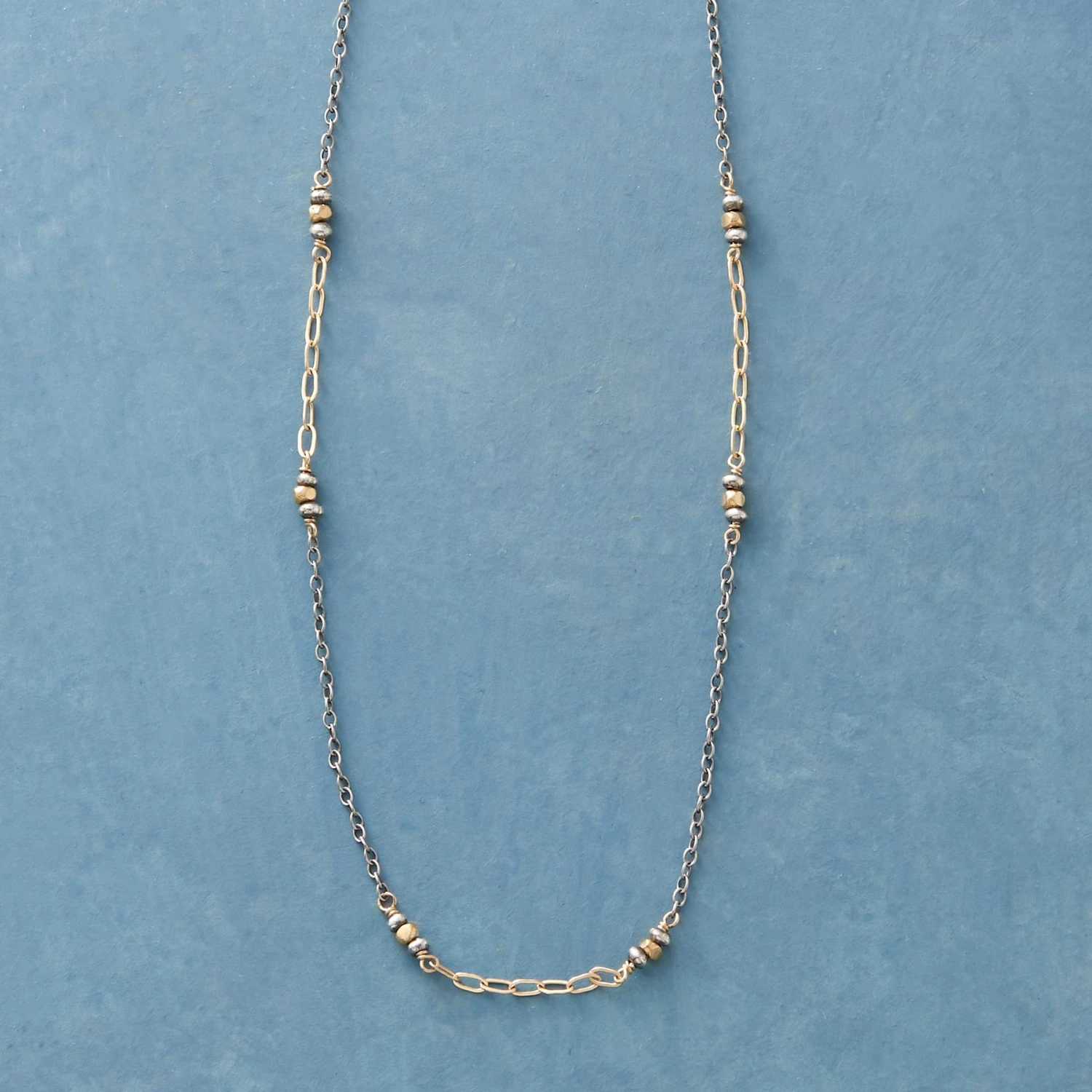 Pebbled beads of sterling silver and 14kt gold fill stack together between varied links of the same in a handcrafted necklace perfect for layering or to wear on its own. Sterling lobster clasp. Made in USA. Exclusive. 22″ to 22-1/2″L.