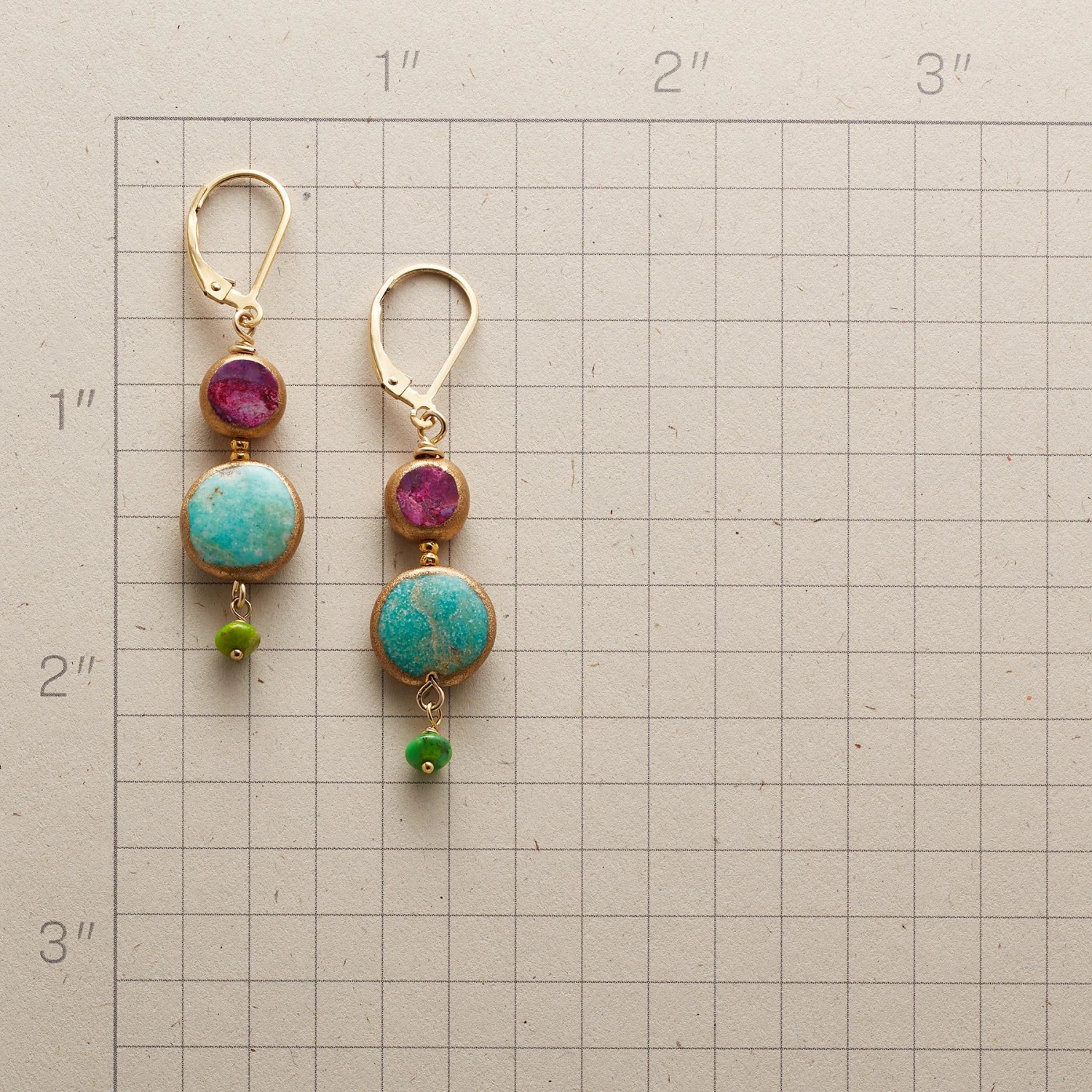 Multicolored turquoise takes a whimsical turn, some stones stabilized, others tinted. Exclusive. Handcrafted in USA with copper bezels, 22kt gold-plated findings, 14kt gold-filled lever back wires. 1-7/8″l.