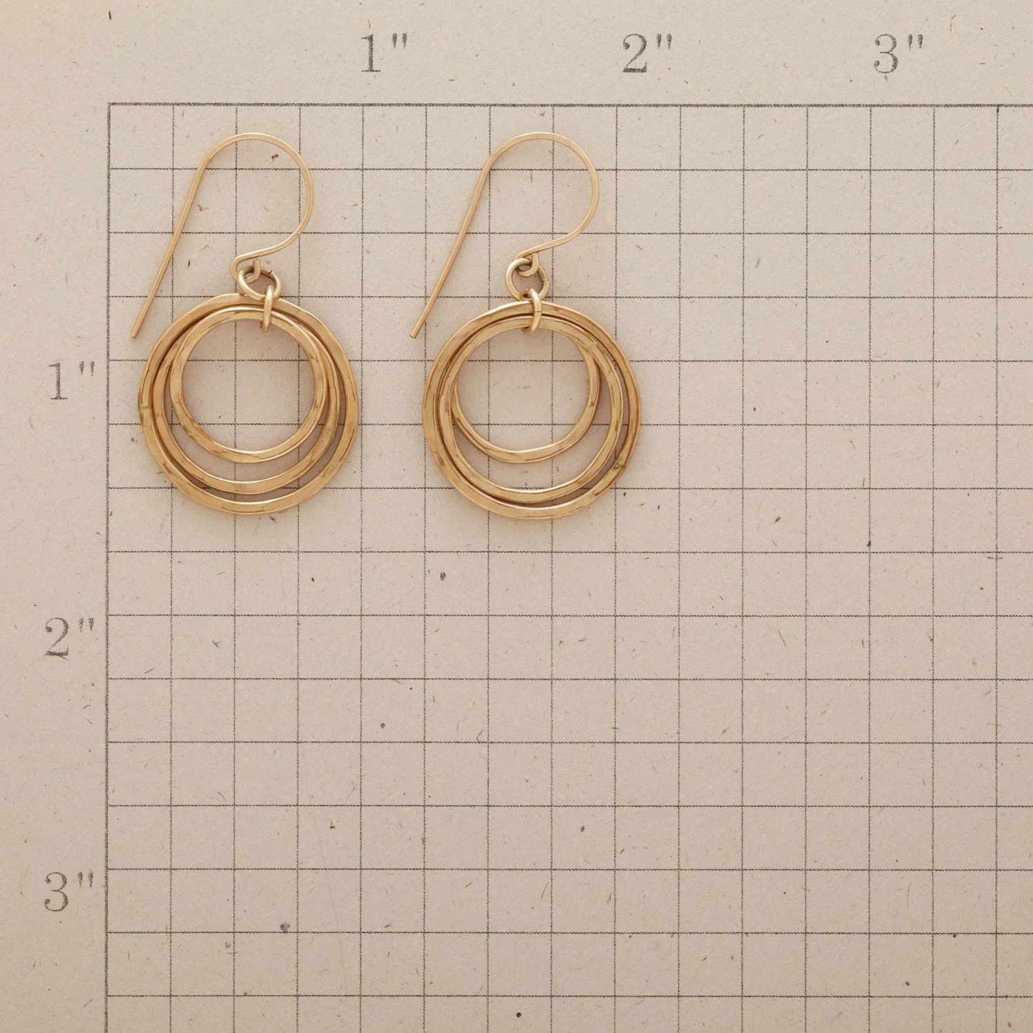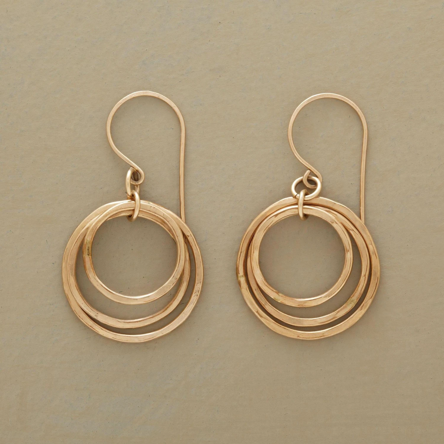 Glimmering 14kt gold-filled rings go ’round and ’round in a trio of hoops that dance and sway harmoniously. Handmade in USA. Exclusive. 1-1/2″l.