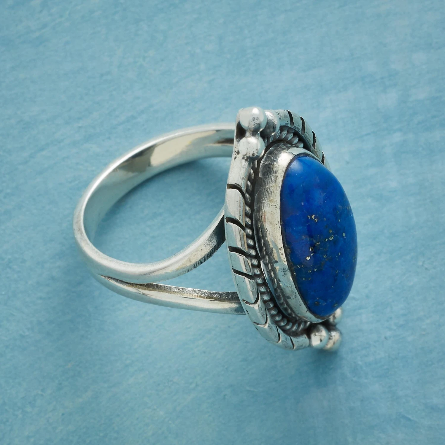 A graceful sterling silver setting with a vintage feel is the perfect complement to our bold blue lapis cabochon. Split-shank band. Exclusive. Whole sizes 5-10. 3/8″w tapers to 1/8″.