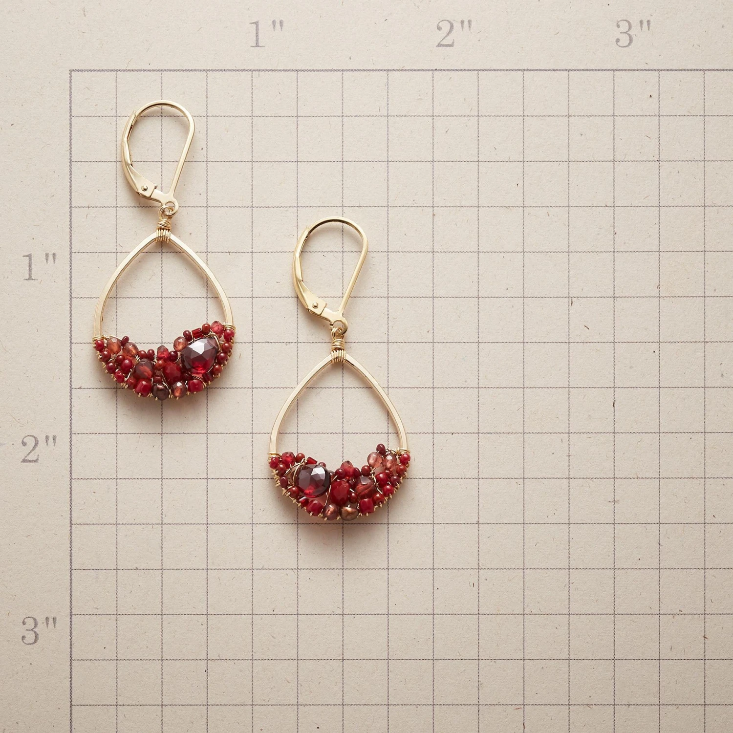 Garnet, cultured freshwater pearl and seed bead cluster within danglers designed by Dana Kellin. 14kt gold filled; lever back wires. Handmade in USA. 1-5/8″L.