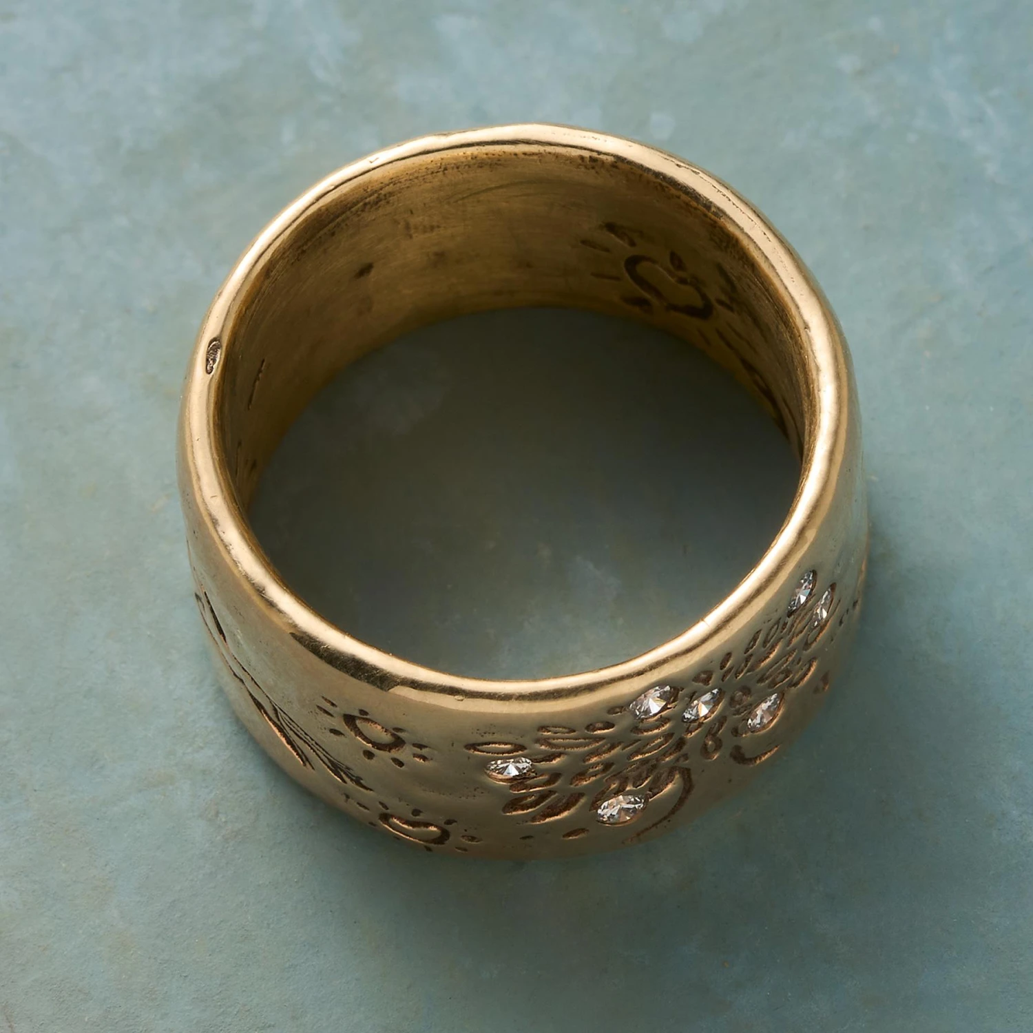 Like light flickering through the leaves, diamonds sparkle on a majestic, hand-etched tree. Inside the wide 14kt yellow gold band are the words “grow strong.” Handmade by Jes MaHarry. Made in USA. Exclusive. Whole sizes 5–9. 3/8″w.