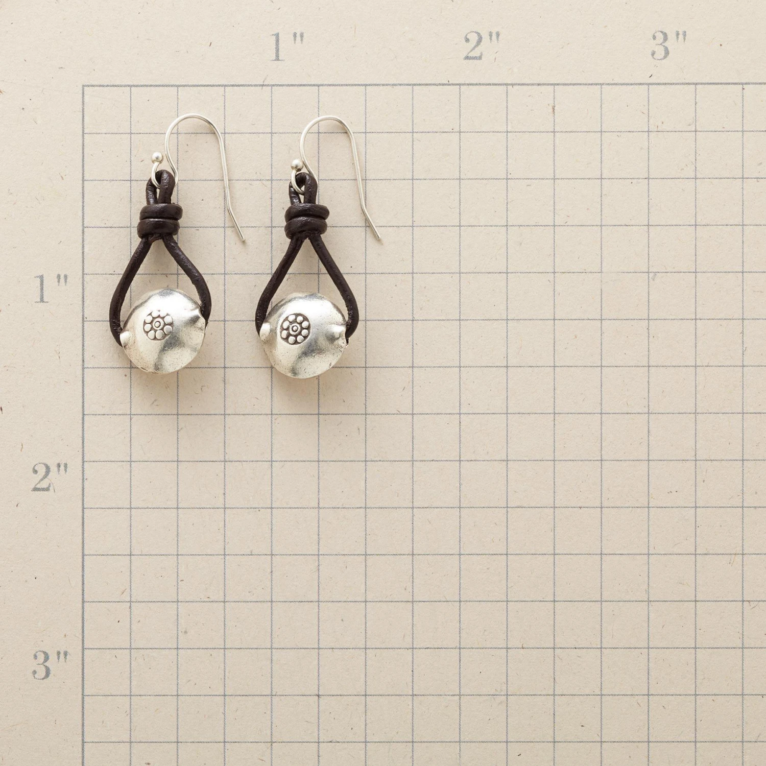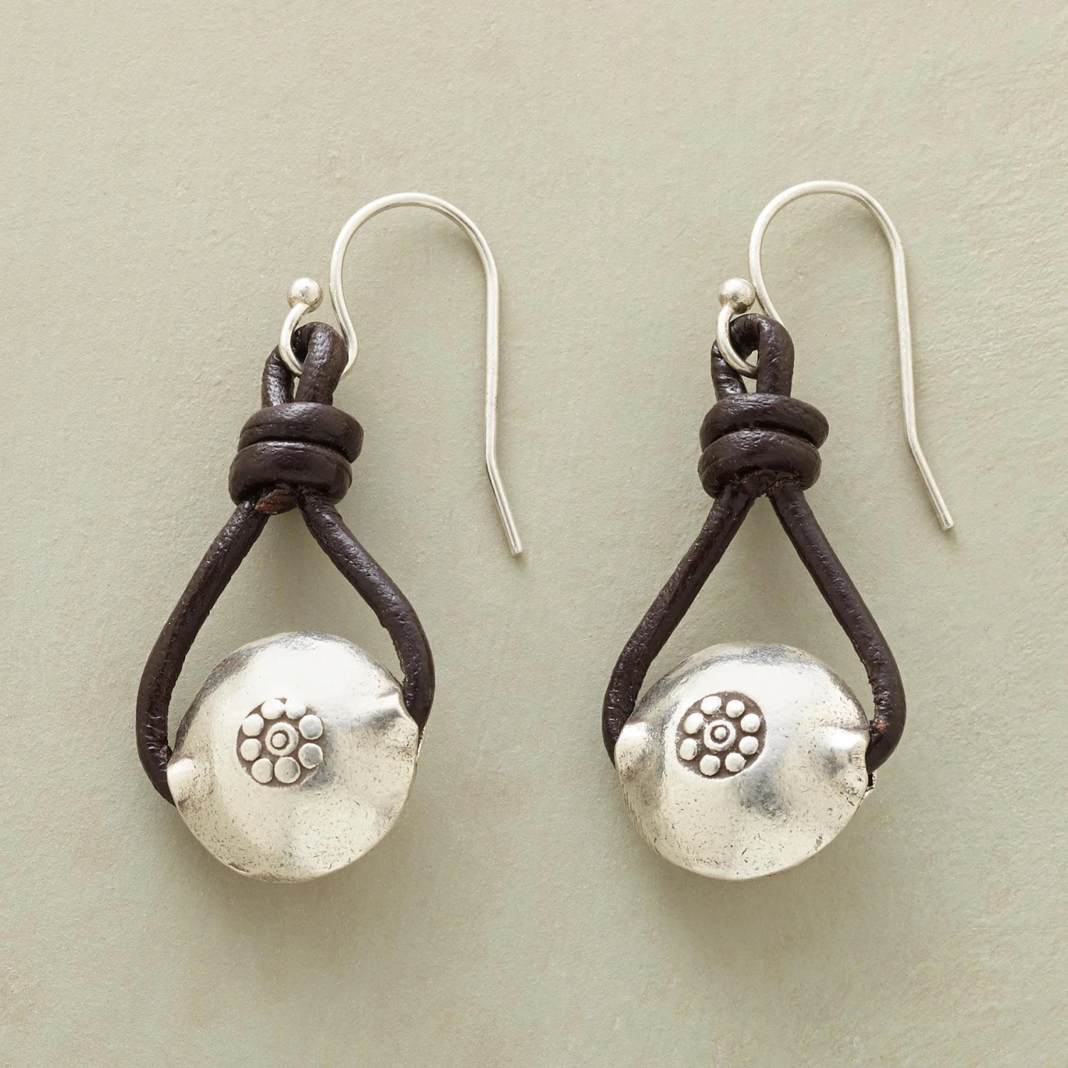 Leather loops hold flower-stamped sterling silver in earrings that make the perfect complement to your best-loved jeans. Sterling silver wires. Exclusive. 1-3/8″L.