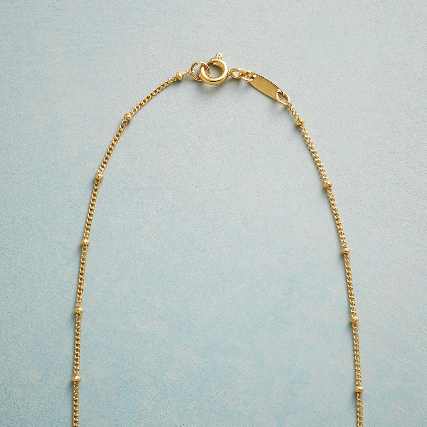 One droplet of lavishly faceted blue topaz embodies a sea of tranquility in this refined necklace. Handcrafted in USA on a beaded 18kt gold plated chain with spring ring clasp. 18″L.