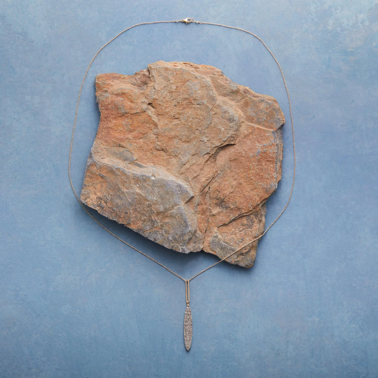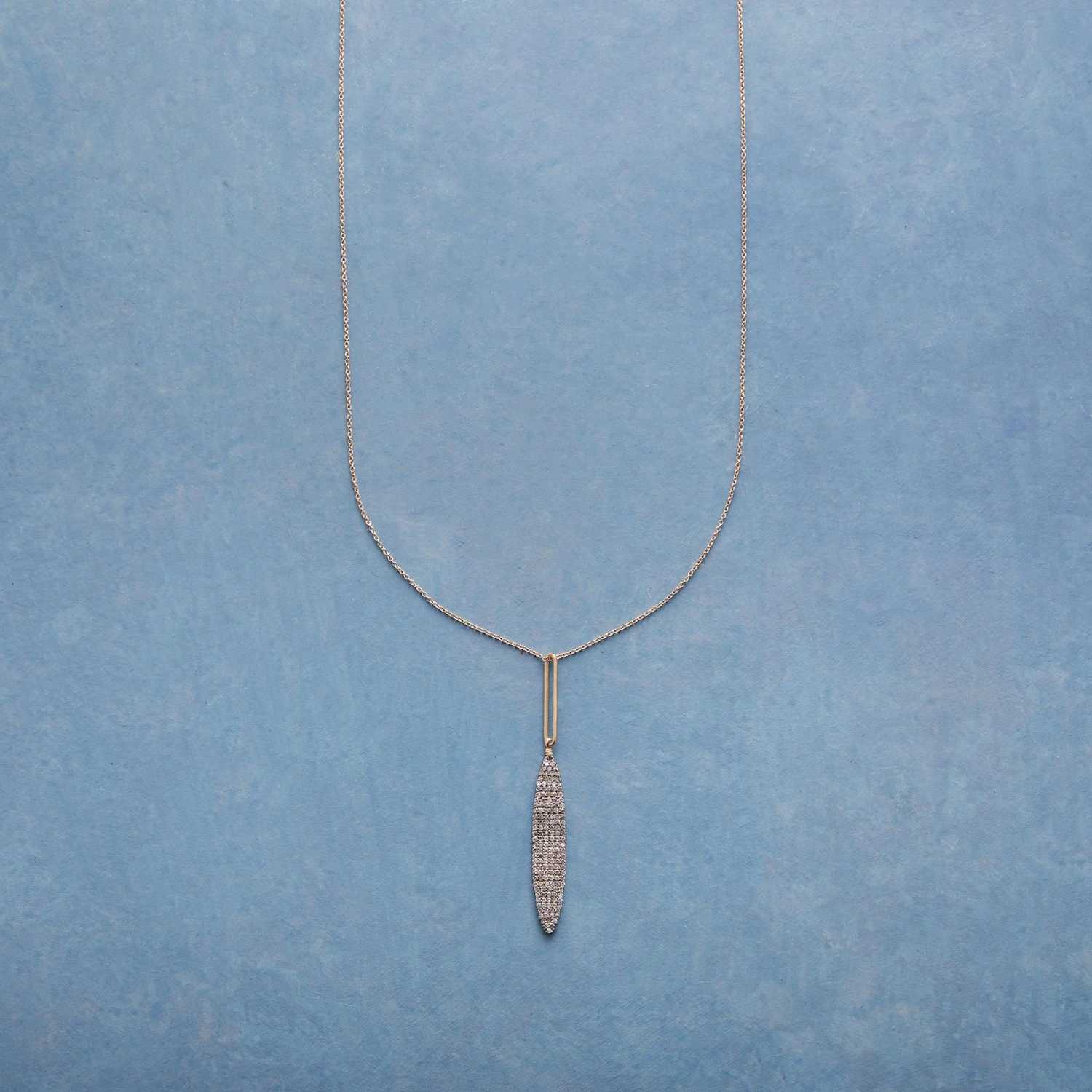 Pavé diamonds light up a long, lovely pendant while a 14kt gold oval echoes its elegant shape. 14kt gold chain and lobster clasp. Handcrafted in the USA by Dana Kellin. 28″L, 2-1/2″ drop.