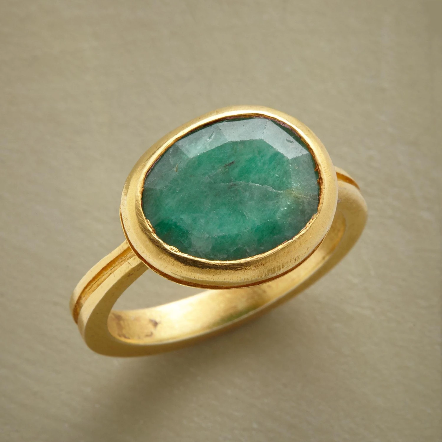 A handcrafted bezel wavers ever so slightly to embrace the individuality of each emerald. Slender band with incised channel; 22kt gold plated sterling silver. Whole sizes 5-10.