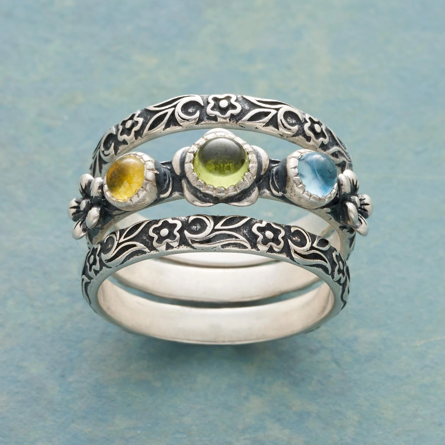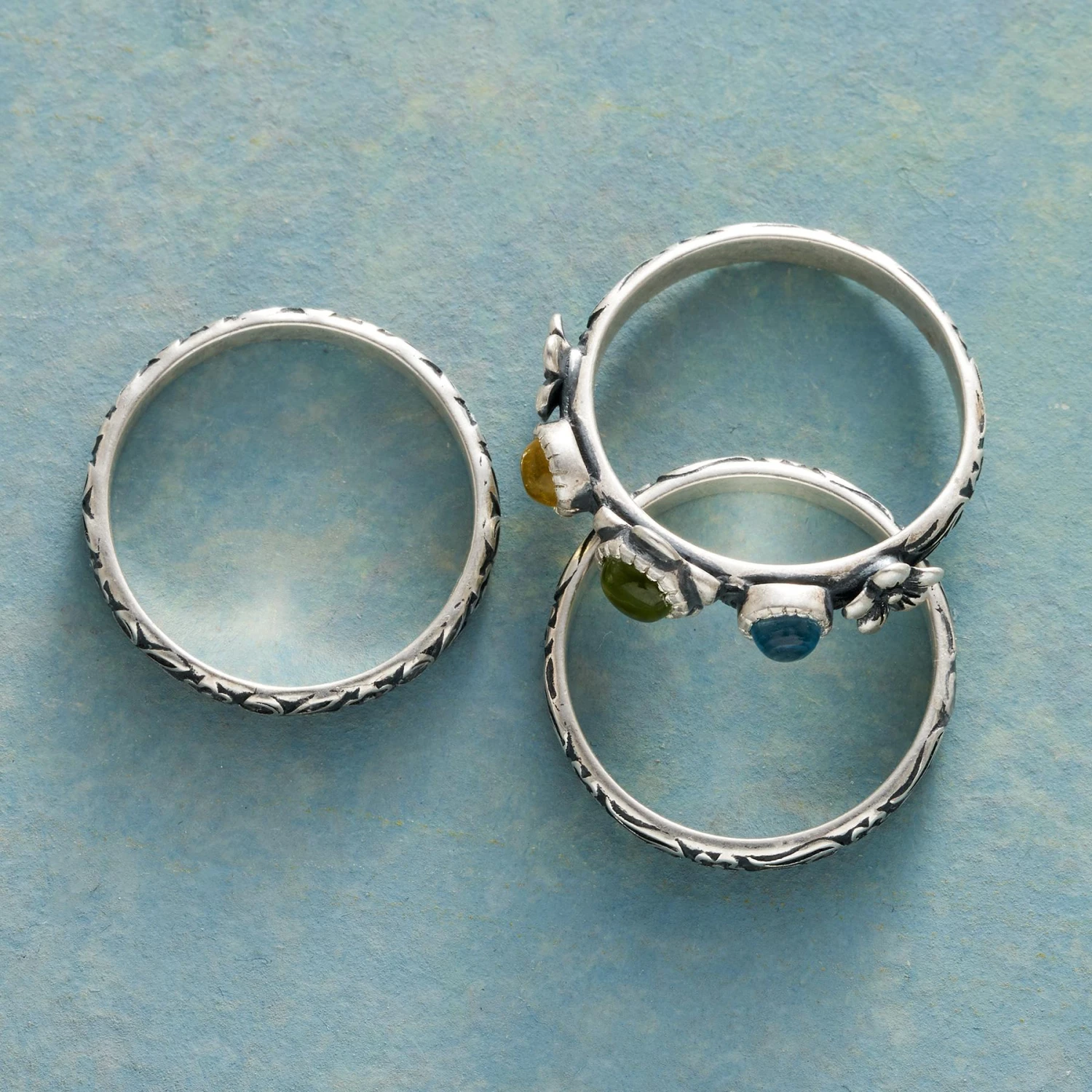 Fresh flowers for your fingers. Our ring set includes three sterling silver bands – two etched all around and one set with yellow quartz, peridot and Swiss blue topaz flanked by 3D blooms. Handmade. Exclusive. Whole sizes 5 to 10. Set of 3.