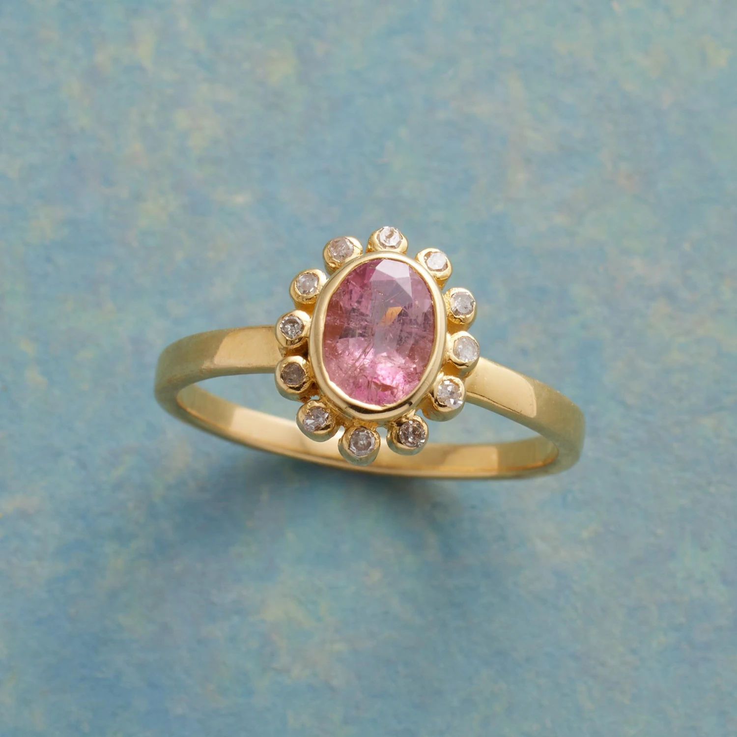 Spring’s fleeting beauty captured in delicate pink tourmaline ringed with diamond petals, blooming atop a 14kt gold-plated band. Handcrafted. Whole sizes 5–9.