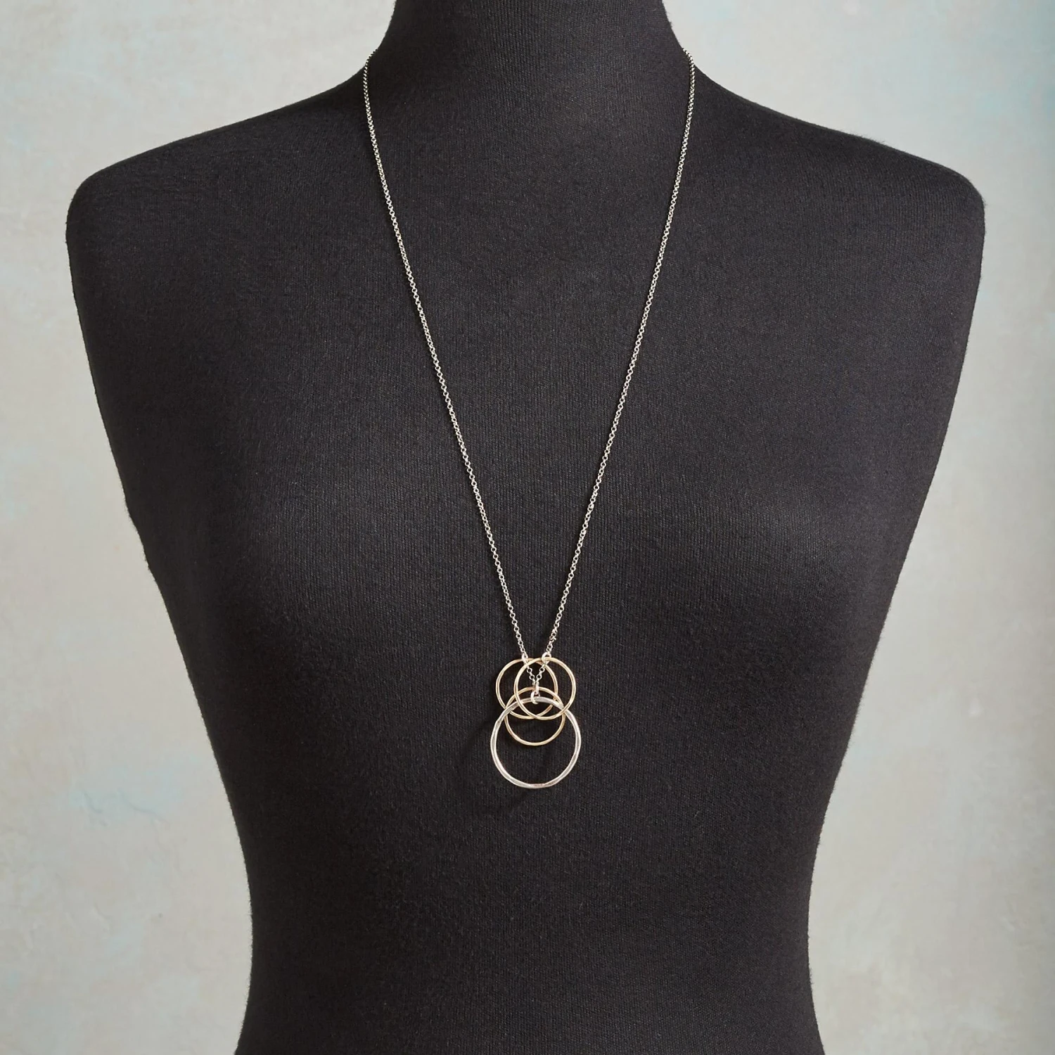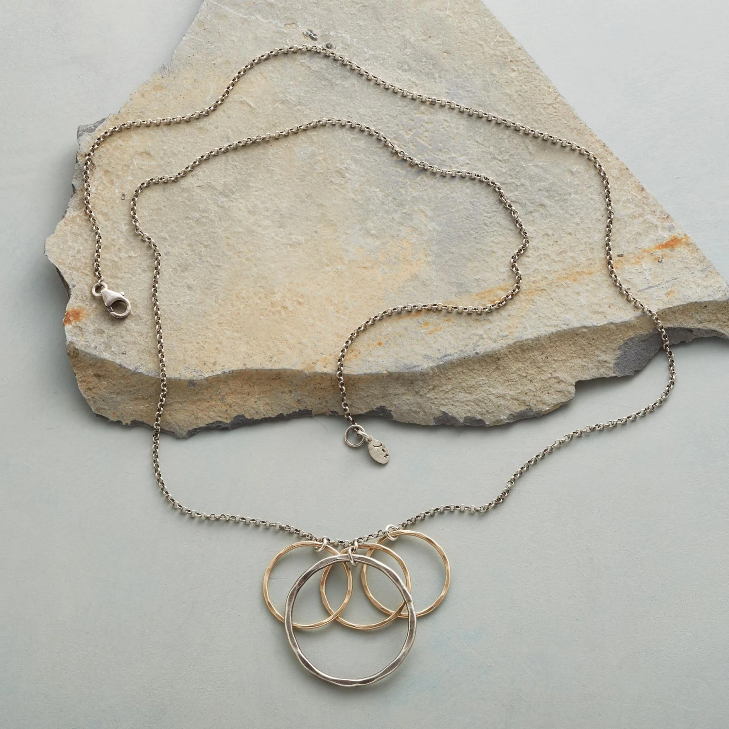 A dainty sterling silver chain holds a host of handcrafted circles, one hammered sterling, the others of hammered 14kt gold filled. Sterling lobster clasp. USA. Exclusive. 30″l.