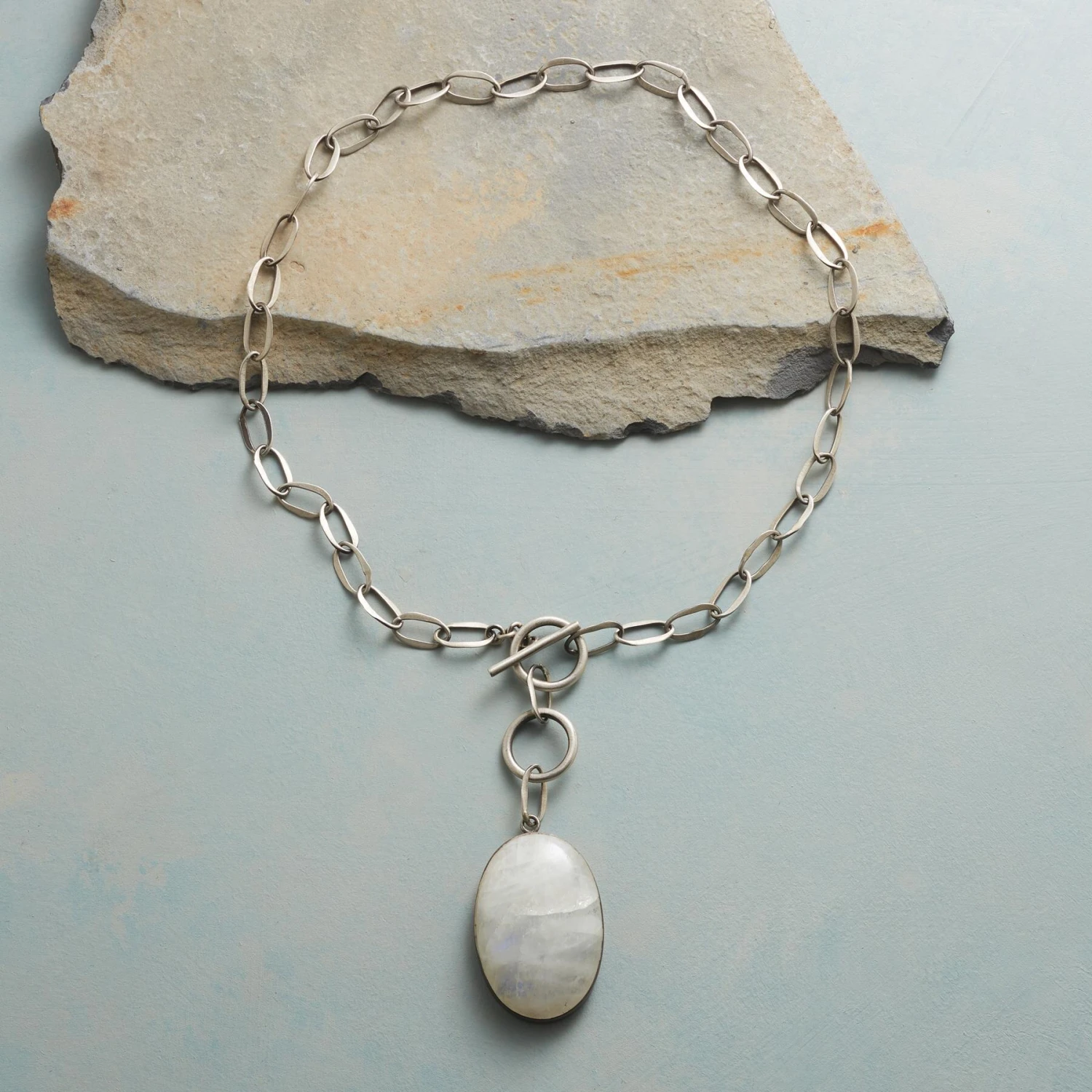 Every element is big, bold and beautiful, from the rainbow moonstone to the centerpiece toggle clasp and hand-hammered oval links. Sterling silver by Jane Diaz. 16″ to 17″L. Drop 2″ to 2-3/4″L.