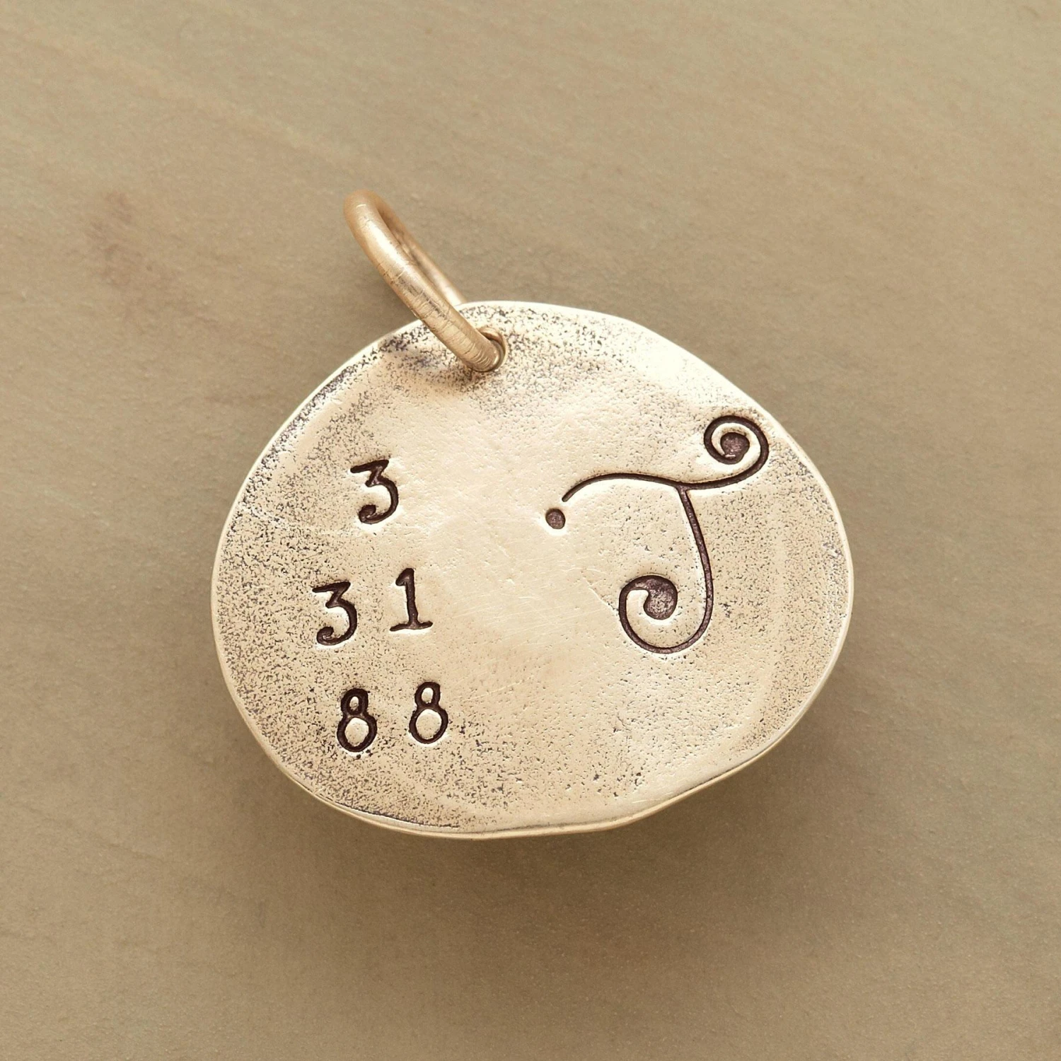 Jes MaHarry’s 14kt gold charm is engraved with date and one initial; stamped heart on reverse. 1″L.