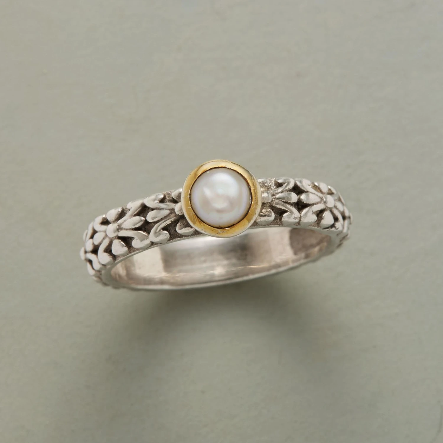 A corona of 14kt vermeil rims our luminous cultured pearl; sterling silver fretwork enwraps the band. Handcrafted exclusive. Whole sizes 5 to 9.