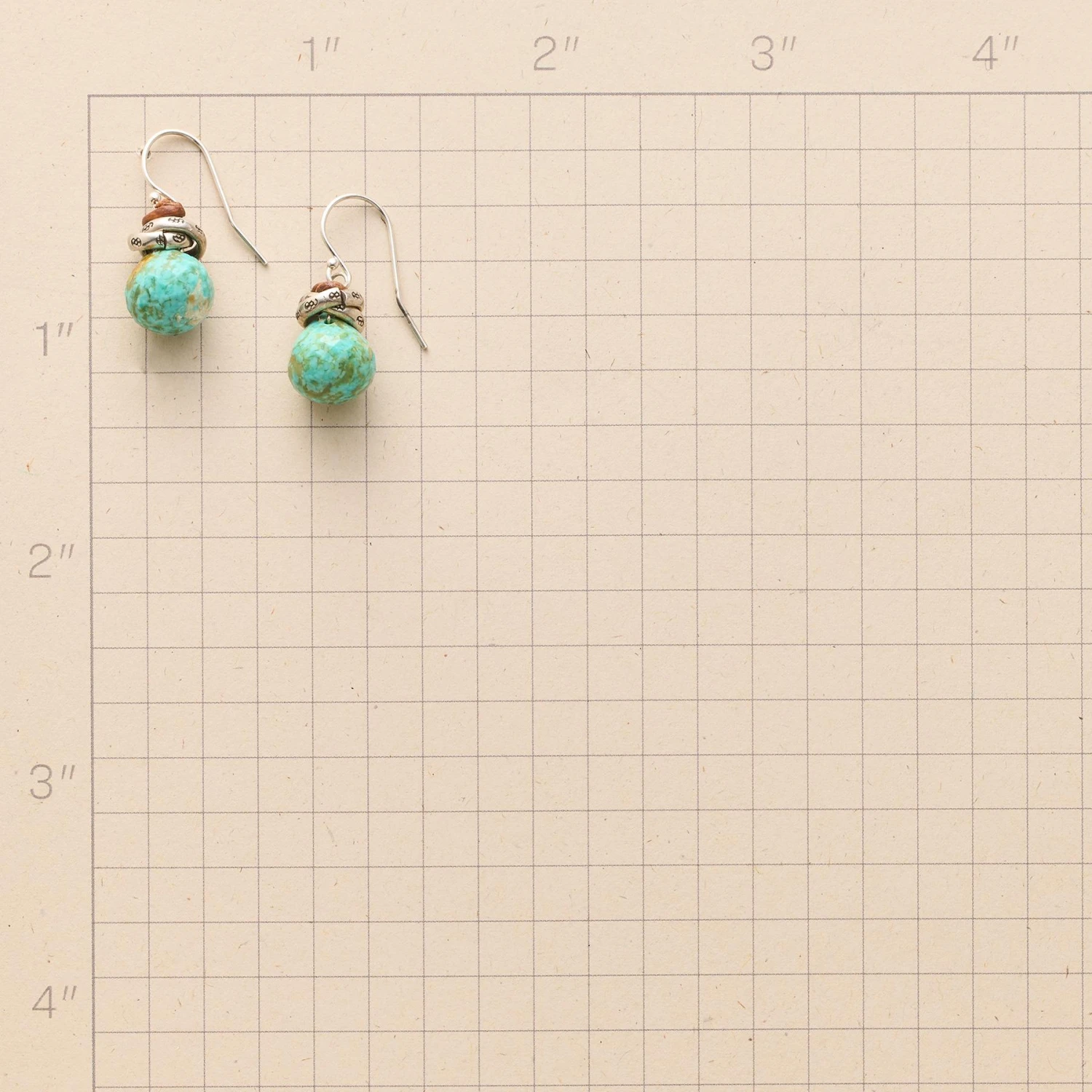 Thai silver beads made by hill tribe artisans orbit the top of tinted turquoise. Knotted to sterling silver French wires with brown leather. Handcrafted in USA. 7/8″l.