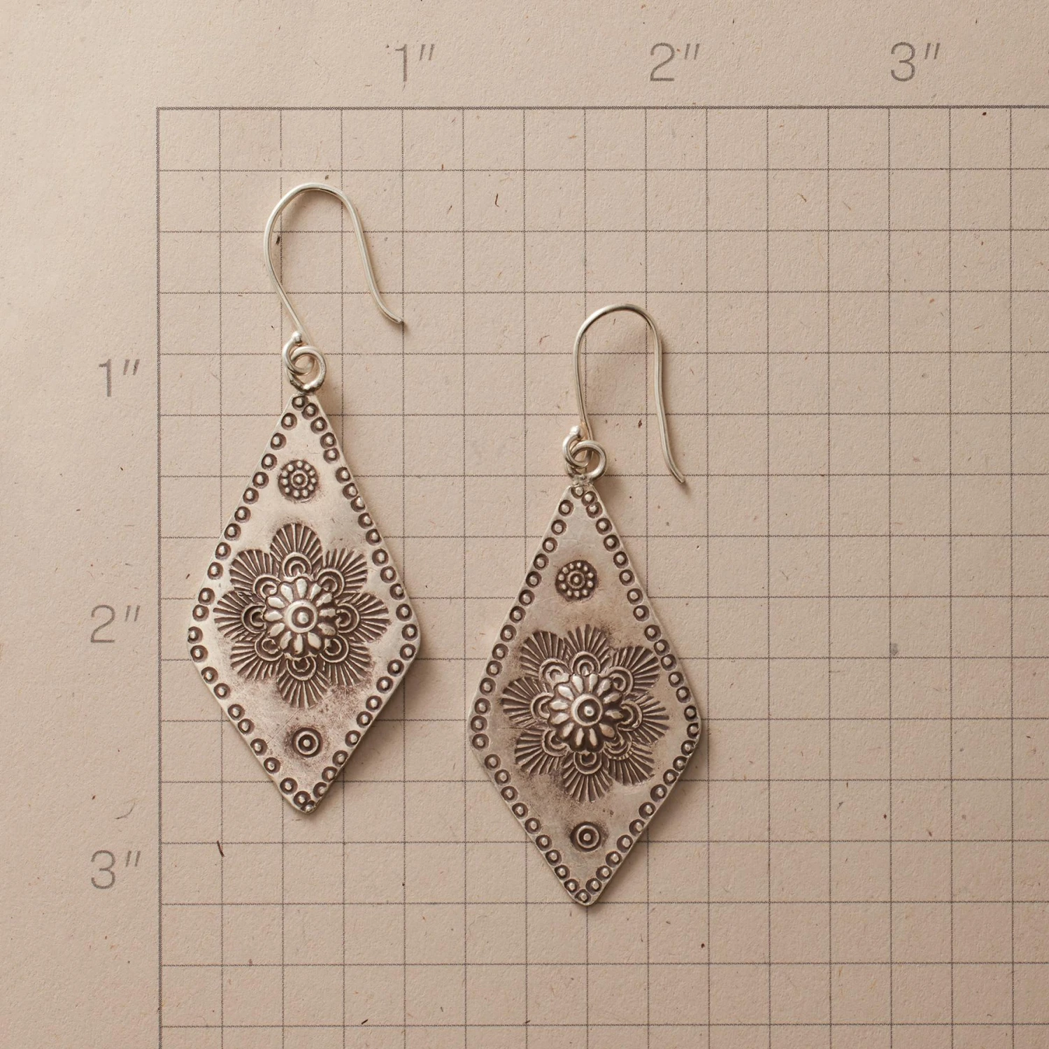 Hand-stamped flowers bloom on long sterling silver diamonds, like motifs from a Persian garden carpet. French wires. Handcrafted. Exclusive. 2-1/4″L.