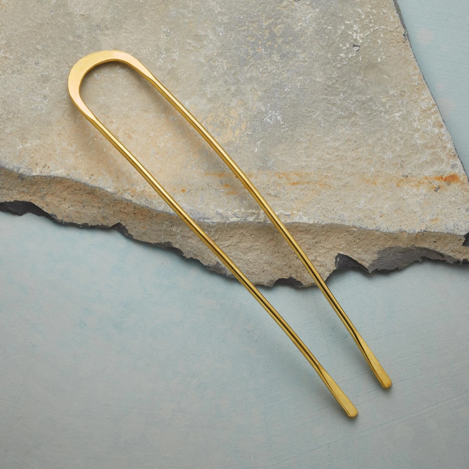 A hand forged underpinning for an updo, from a French twist to a chignon to a top knot. Brass. 5-1/2″L.