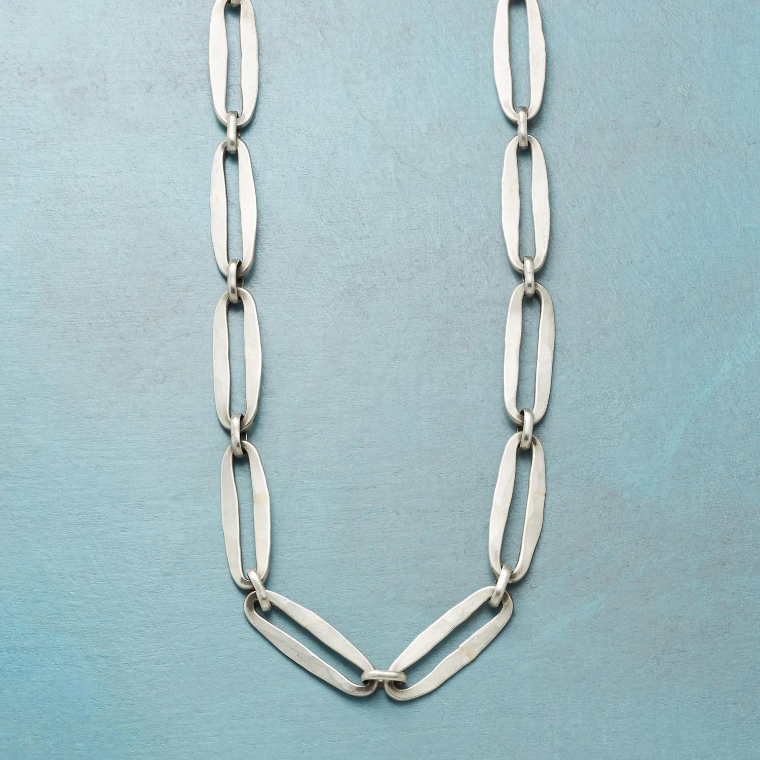 Each hammered oval link joins the next, showing strength. Handcrafted by Jane Diaz of matte sterling silver. Hook clasp. 20″ to 23″L.