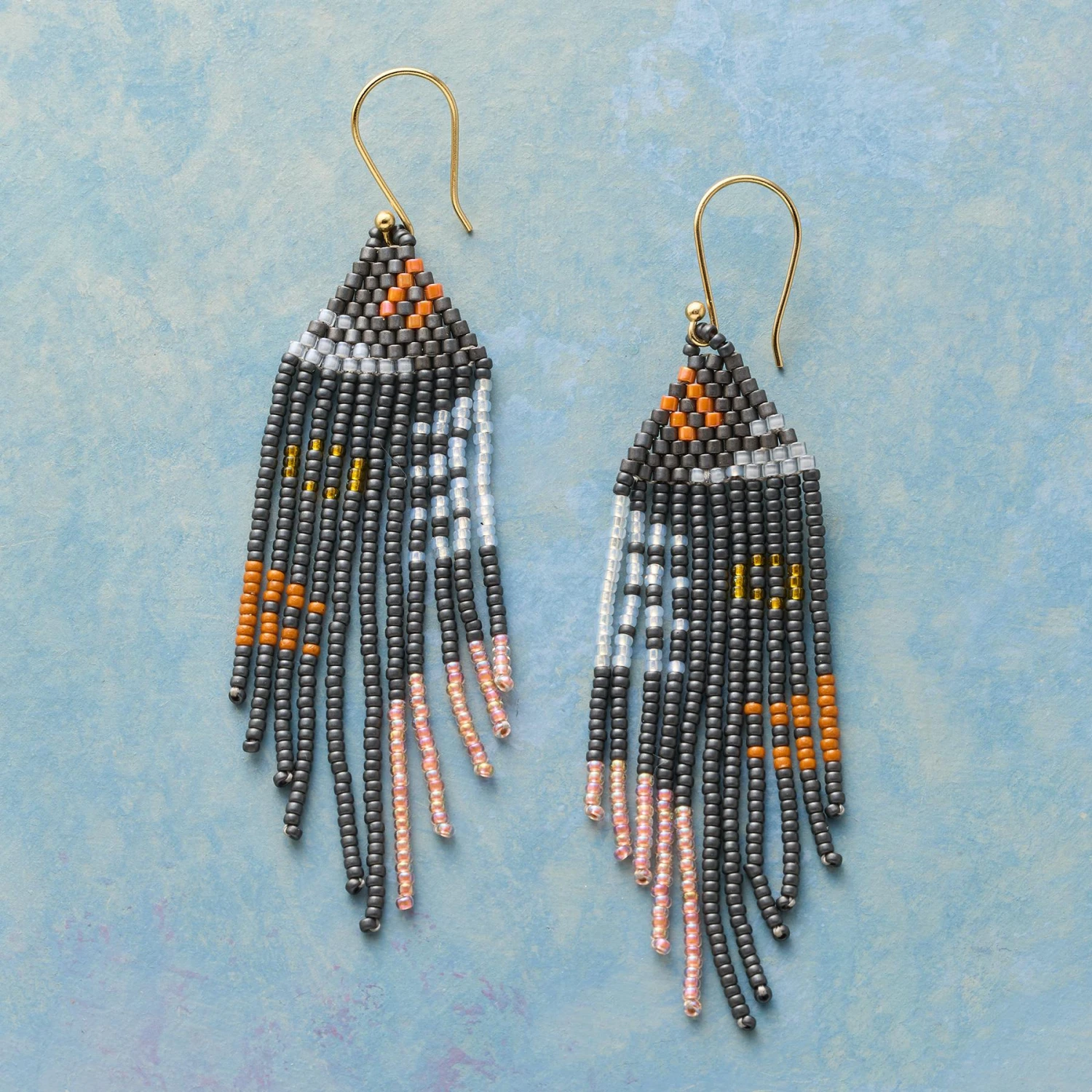 Triangular weavings cap long, flowing fringes of Japanese glass beads…mostly matte, some sparkling with every move. 14kt gold-plated French wires. Handcrafted. 3-1/8″l.