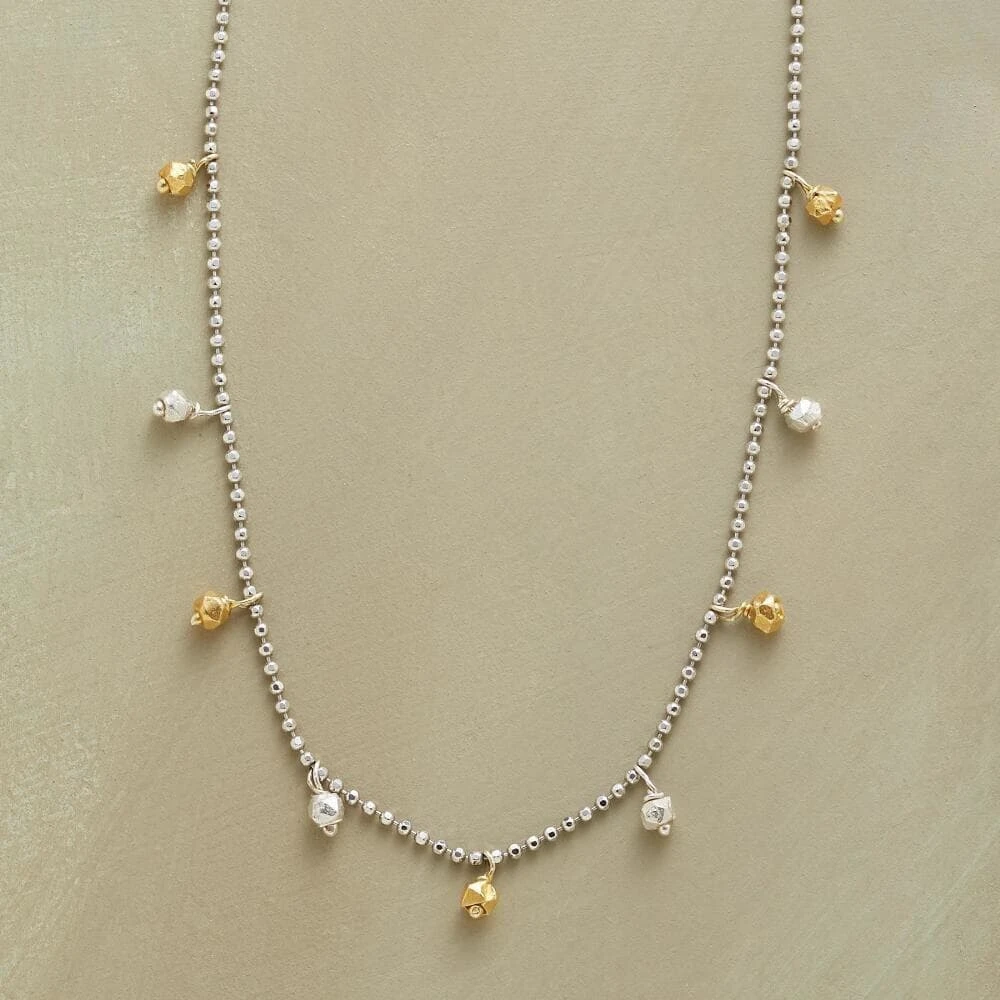 A silver and gold bead necklace, in which faceted Thai beads in sterling silver and 24kt goldplate are spaced along a rhodium-plated, diamond-cut chain. USA. Exclusive. 16″L.