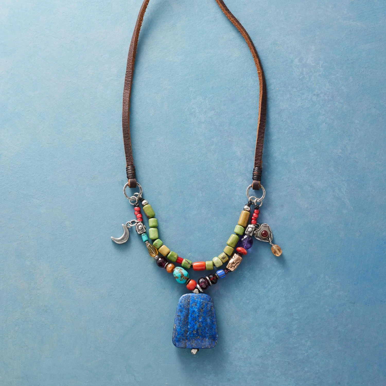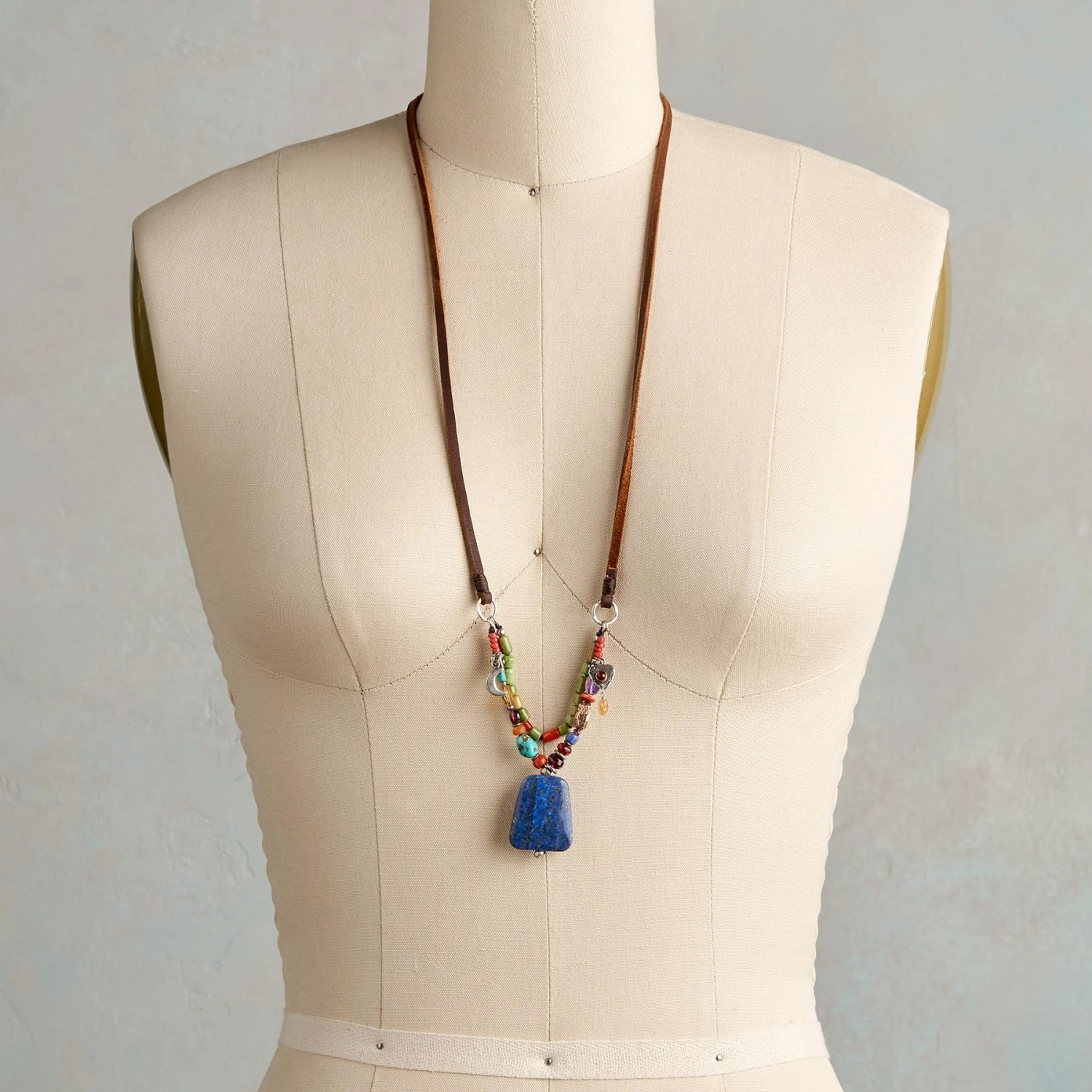 A soft-cornered trapezoid of lapis anchors two strands of bright gems and antique trade beads. Created by Jes MaHarry, it’s punctuated with handmade charms in 14kt yellow and rose gold and sterling silver. Stones include green turquoise, amethyst, citrine, garnet and ancient coral. A sterling slider adjusts the length along leather laces. Handmade in USA. Exclusive. 30″l, 1-1/4″ drop.