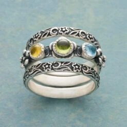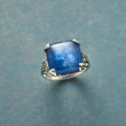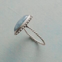 Our hammered sterling silver band is spanned by a bridge of hand-set iolite, sparkling and strong. Handmade. Exclusive. Whole sizes 5–9. 3/8″ to 1/4″l.