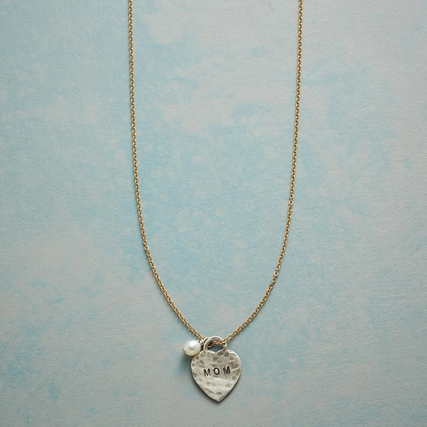 This dainty 14kt gold-filled necklace dangles a cultured freshwater pearl alongside an engraved sterling silver heart that says “MOM”. Spring ring clasp. Made in USA. Exclusive. 16″ to 18″L.