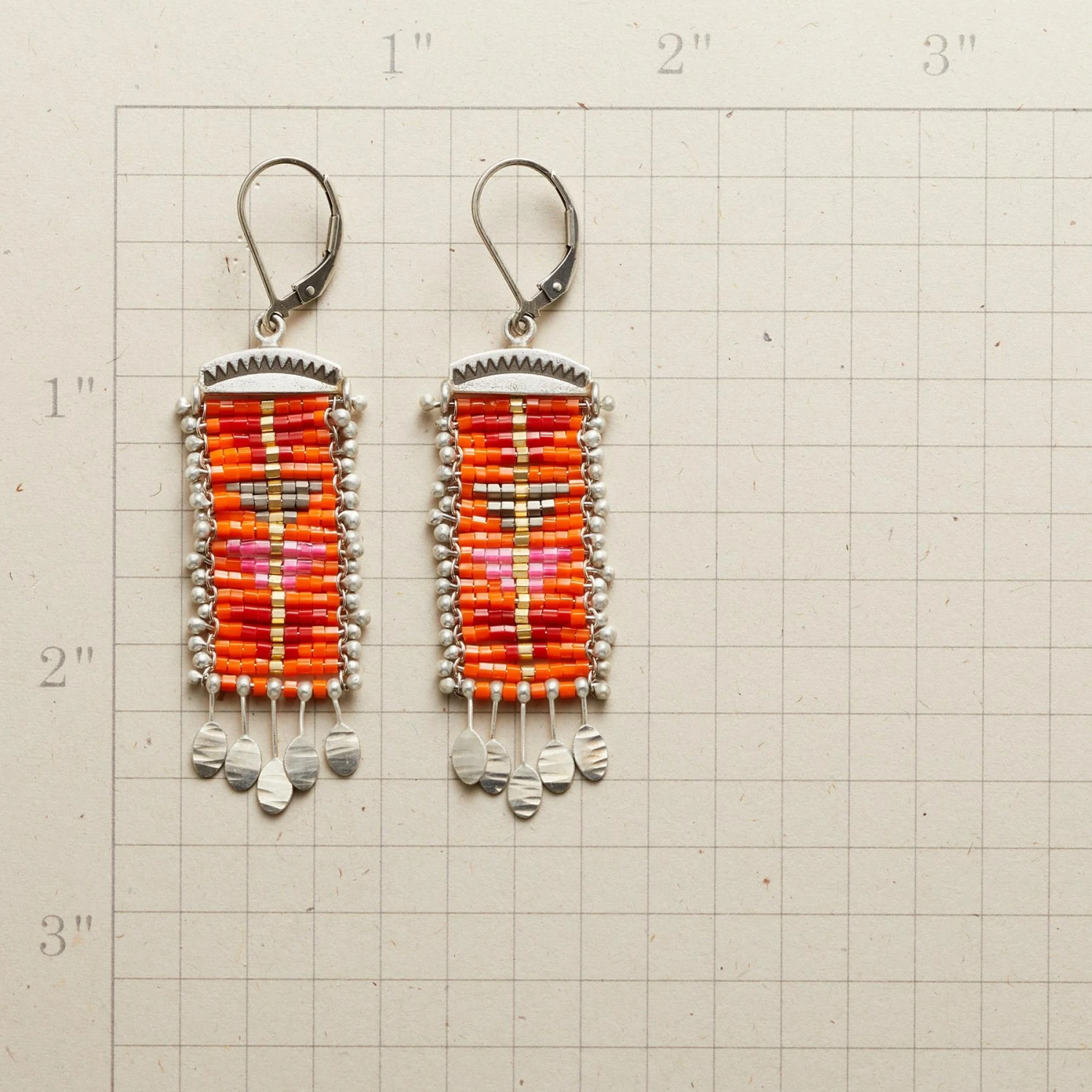 Glass seed beads in blazing sunset hues are strung along sterling silver wires in these earrings by Santa Fe artist Naomi Herndon and her silversmith husband Mark. Suspended from sun-stamped arcs and finished with sterling fringe, they swing and sparkle. Sterling lever-back wires. Exclusive. Approx. 2-1/2″L.