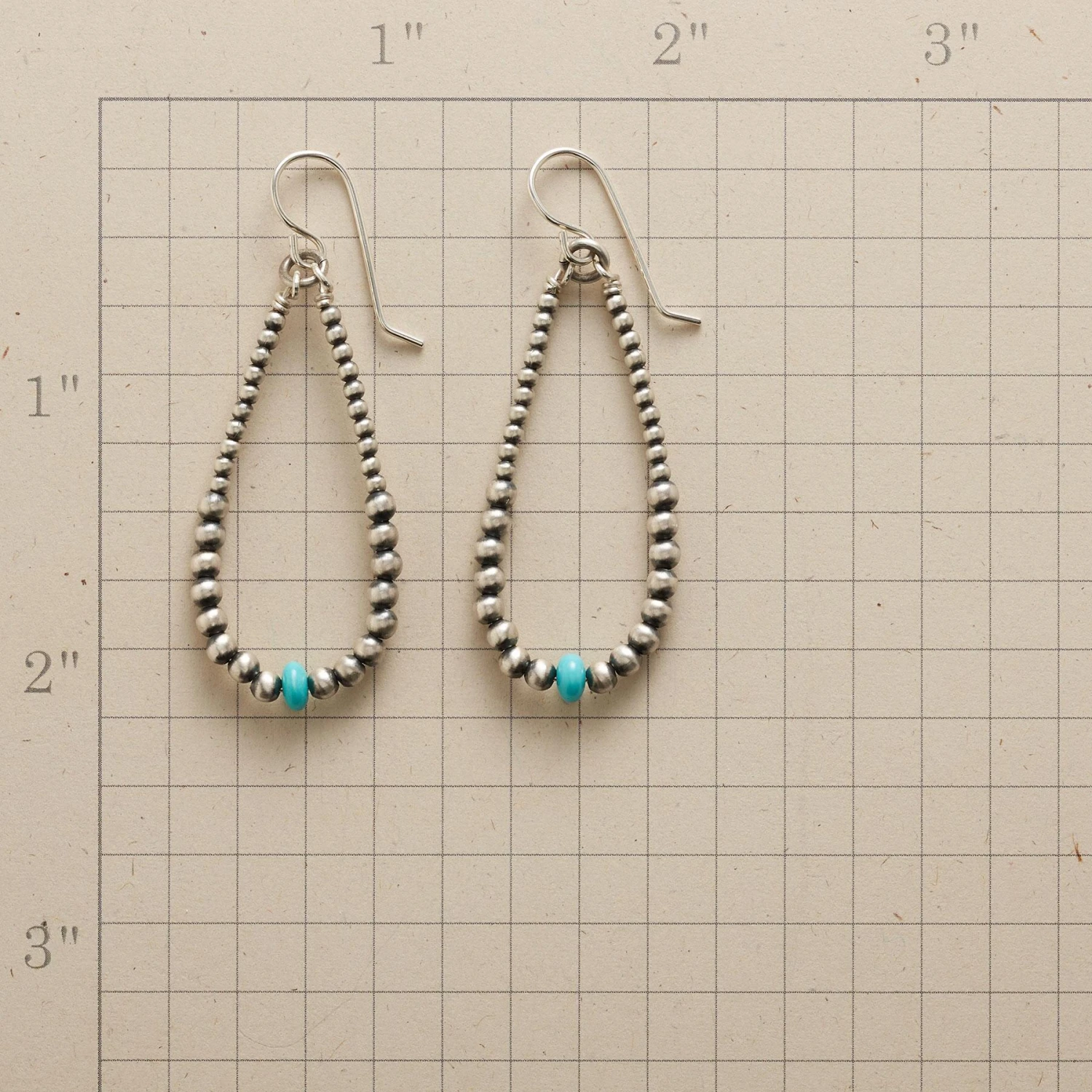 Turquoise-centered loops are strung amid the satin-finished sterling silver Navajo pearls. French wires. Exclusive. Made in USA. 2″L.