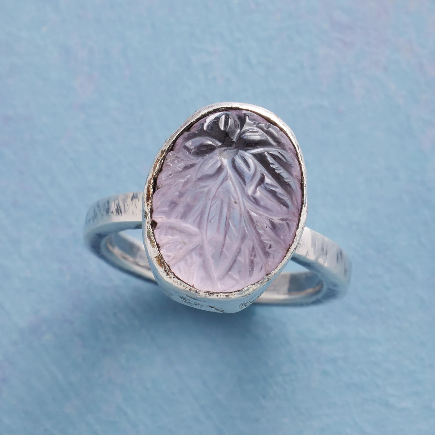 Carved with lush flowers and foliage–tribute to the stonecutter’s artful eye and exceptional skill—an oval amethyst crowns our sterling silver ring. The stone is showcased in a deep bezel atop a thick, hammered band. Handcrafted. Exclusive. Whole sizes 5-10.