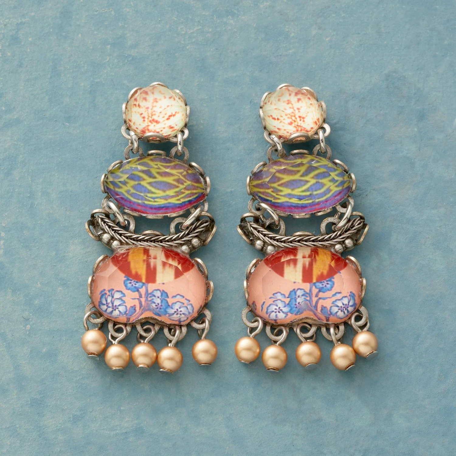 Faceted glass crystals, hand-set over printed fabrics create fantastical flower-filled gems. Trimmed with pearly baubles and set on silver-plated posts, these three-tiered earrings catch the light with every move. 1-3/8″L.