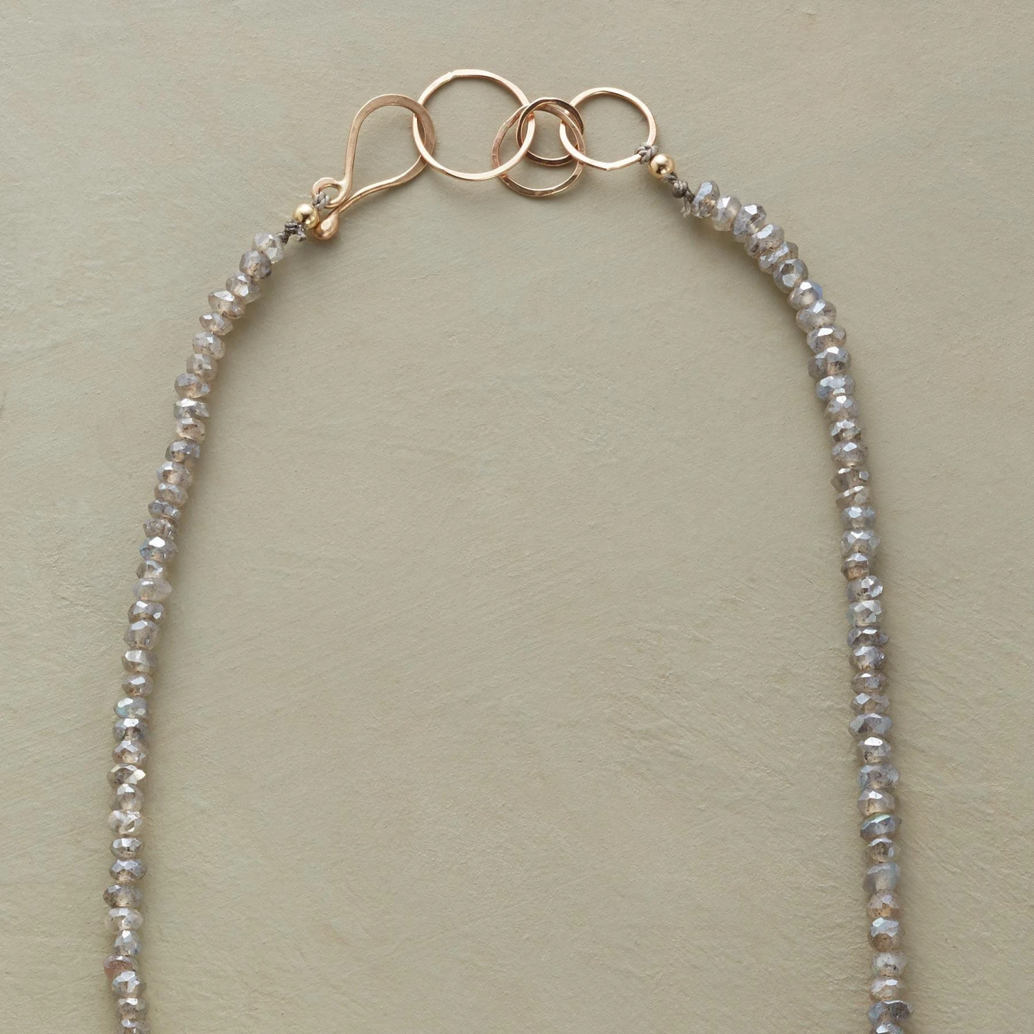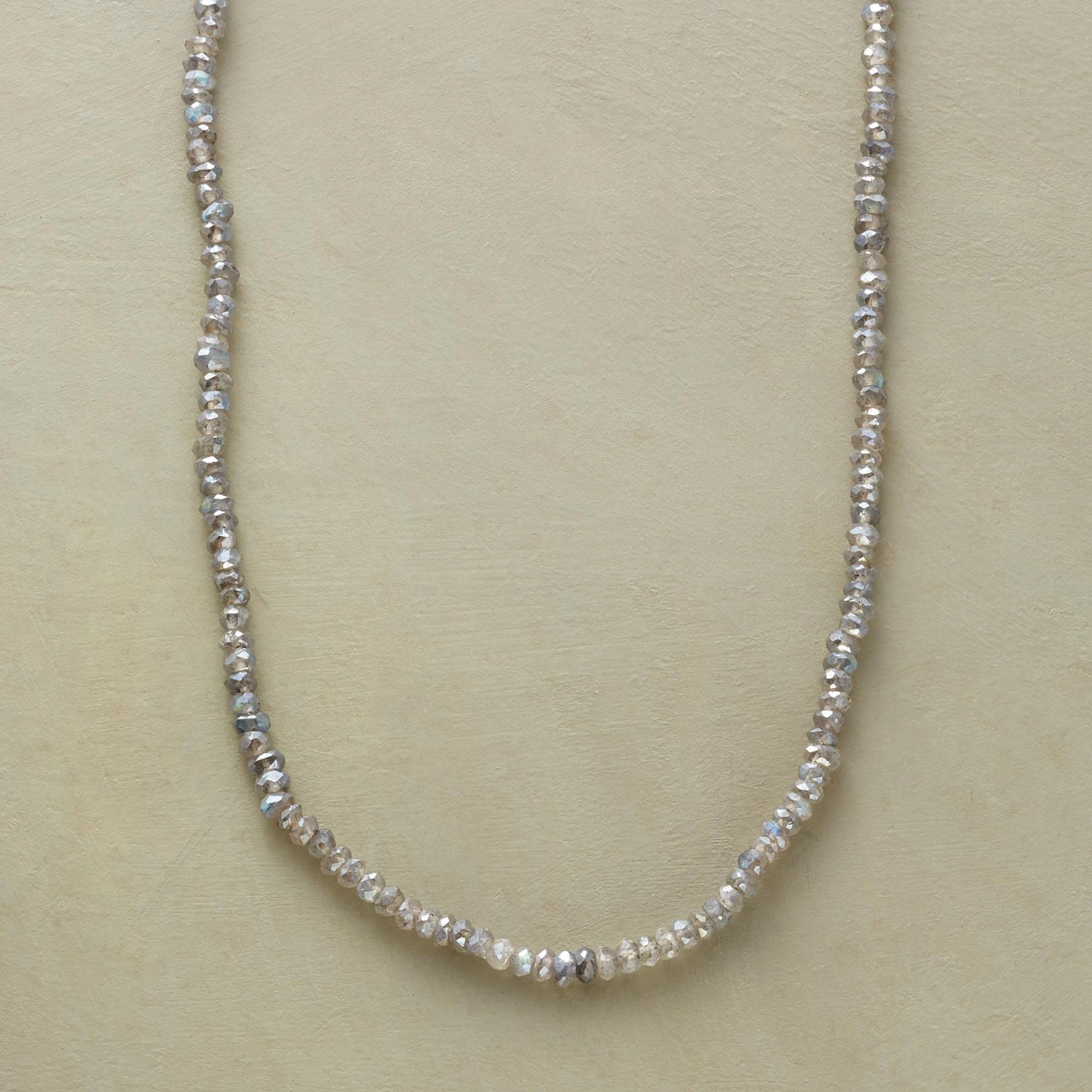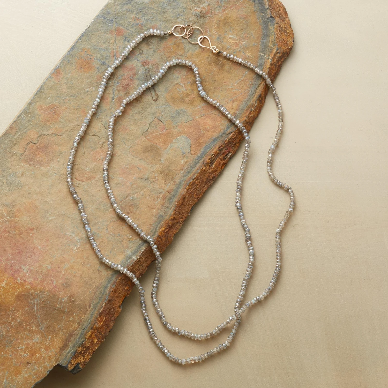Countless little labradorites, each its own mix of smoky iridescence, leave behind a trail of sparkle. Handcrafted in USA by Kyoko Honda with 14kt gold hook clasp. 32″ to 32-1/2″L.
