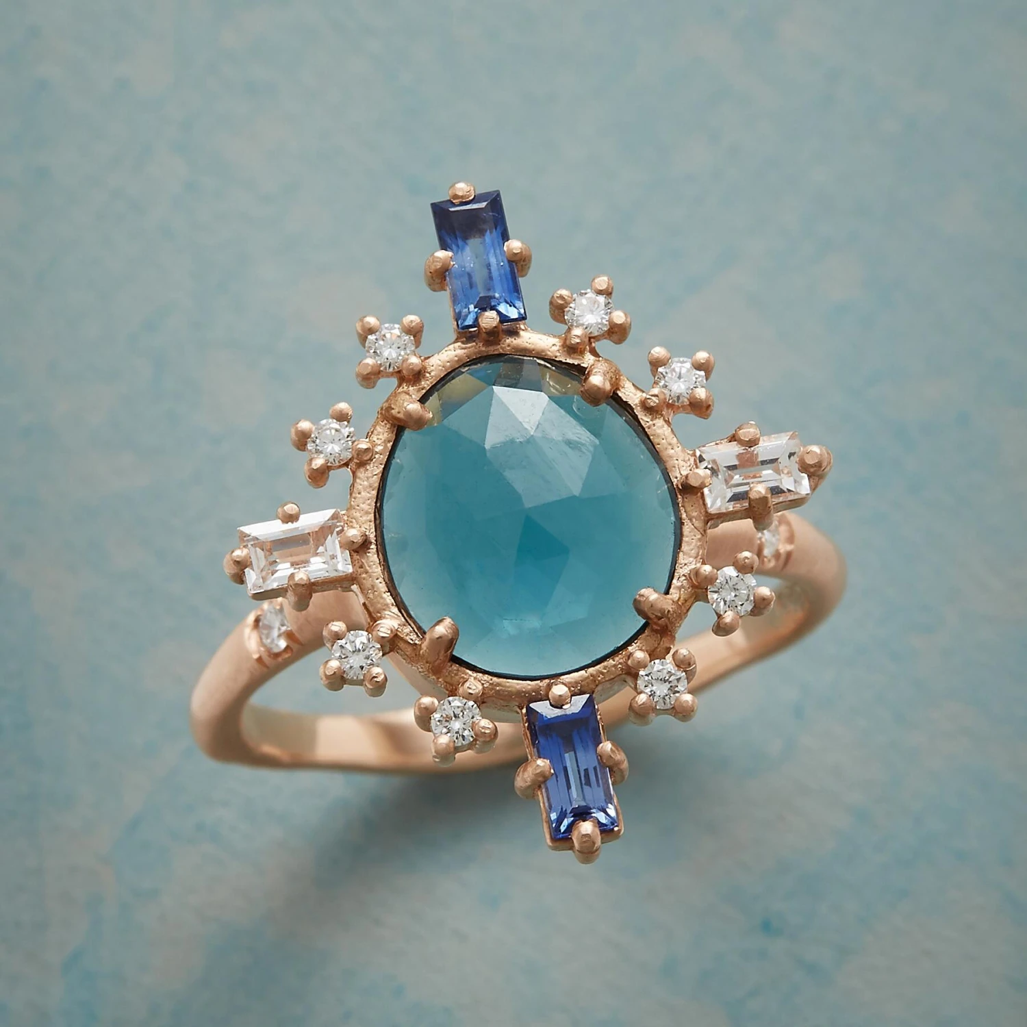 Blue tourmaline, white and blue sapphires and diamonds create a starburst of brilliant color and beauty in Christopher and Mai’s handcrafted ring of 14kt rose gold. Made in USA. Whole sizes 5 to 9.