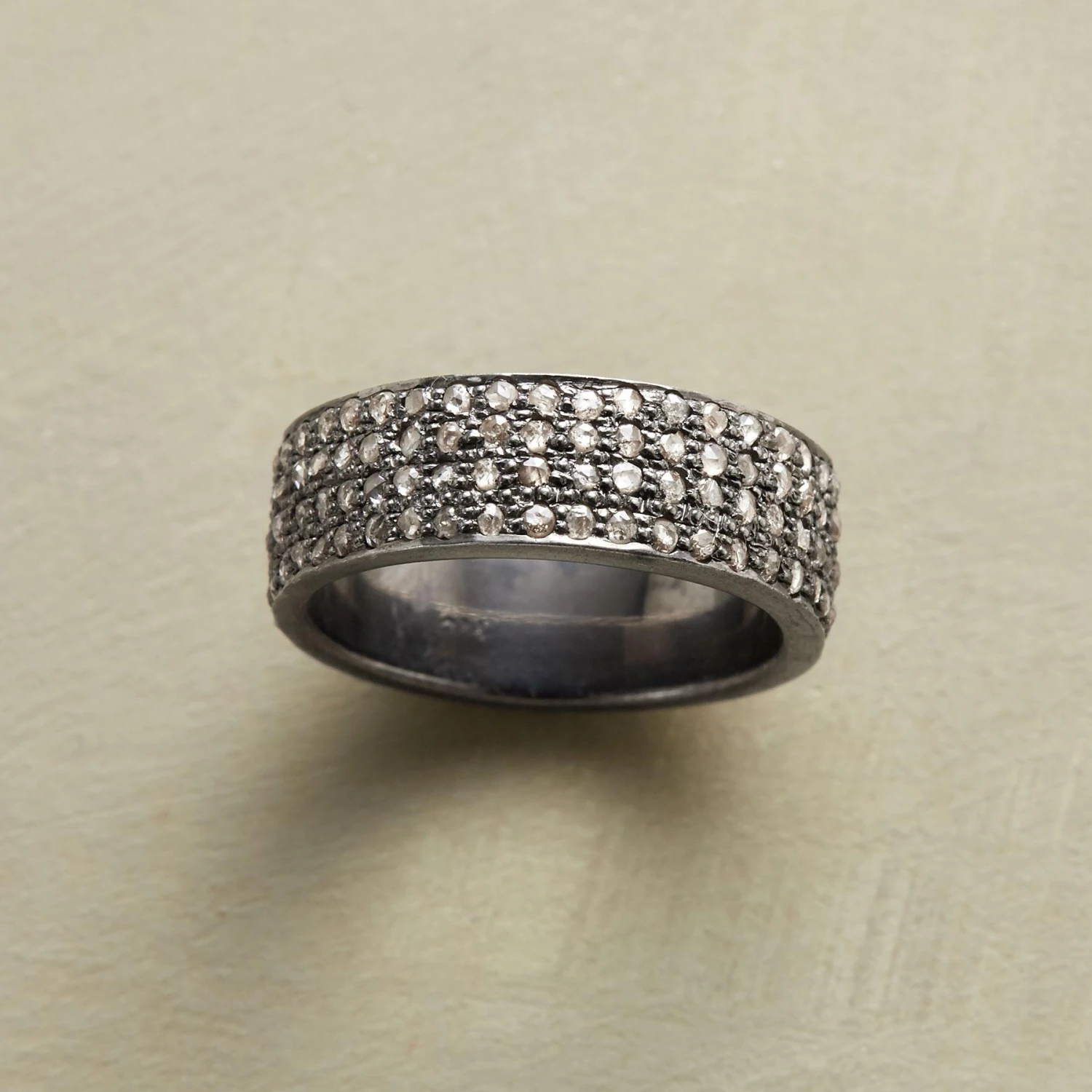 In this black rhodium-plated diamond ring, tiny diamonds sparkle like a night of a thousand stars. A Sundance exclusive in black rhodium-plated sterling silver hammered, carved and buffed. Whole sizes 5 to 9.