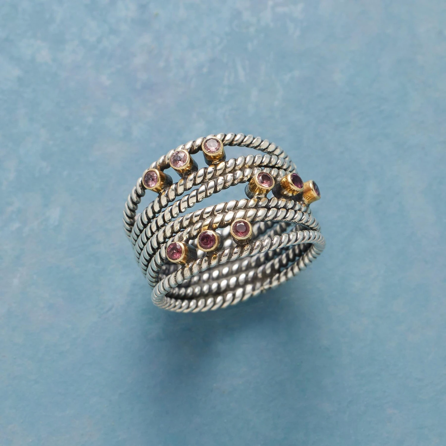 Rope-twisted sterling silver wraps ’round and ’round, lassoing trios of pink tourmaline amid gleaming coils. Handcrafted. Exclusive. Whole sizes 5-10. 5/8″w tapers to 3/8″w.