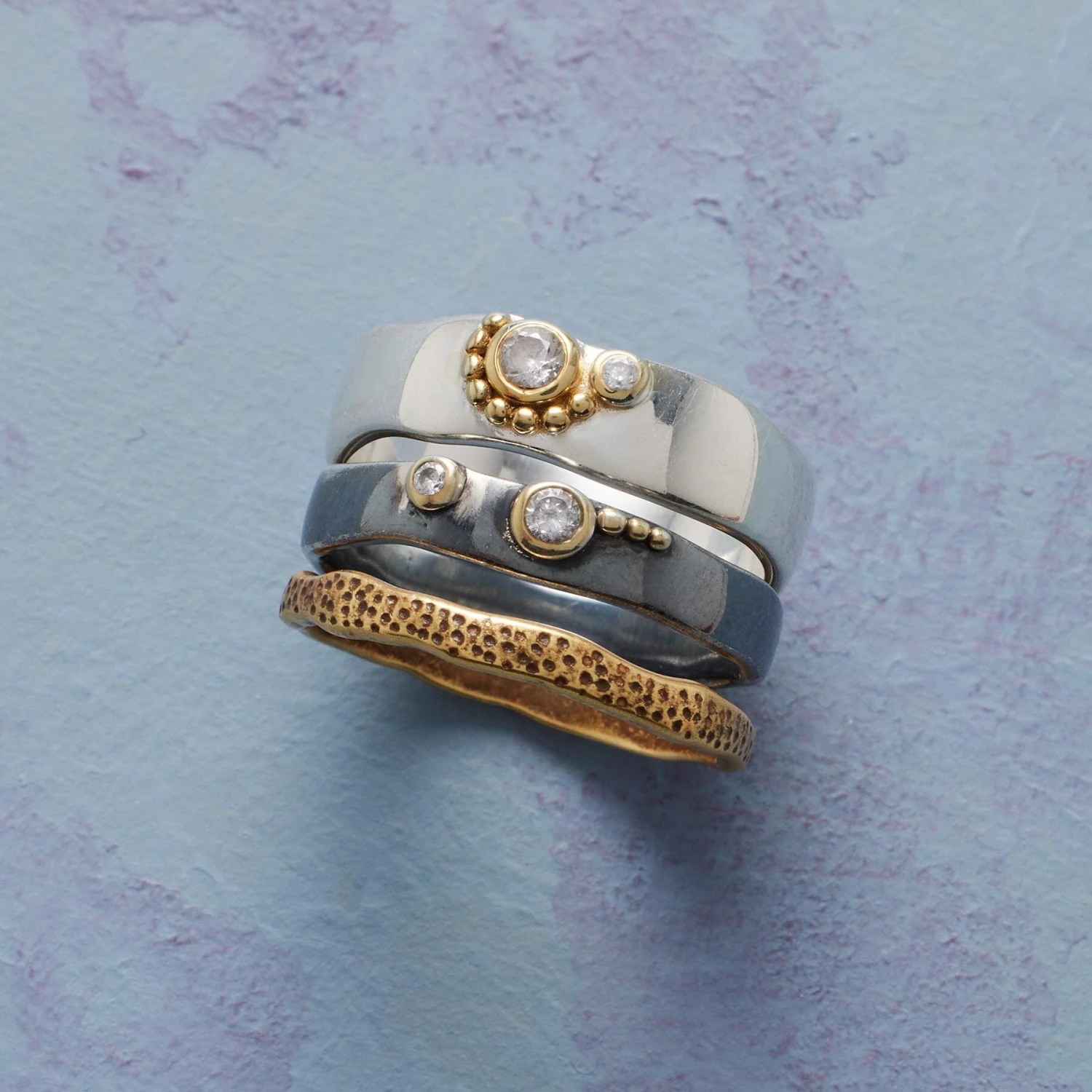 Three unique, handcrafted rings come together in one striking set. Two – sterling silver and black ruthenium-plated – are set with white topaz and accented with 18kt gold plating. A stippled 18kt gold-plated band offers the perfect complement. Exclusive. Whole sizes 5-9. Approx. 1/2″ together.