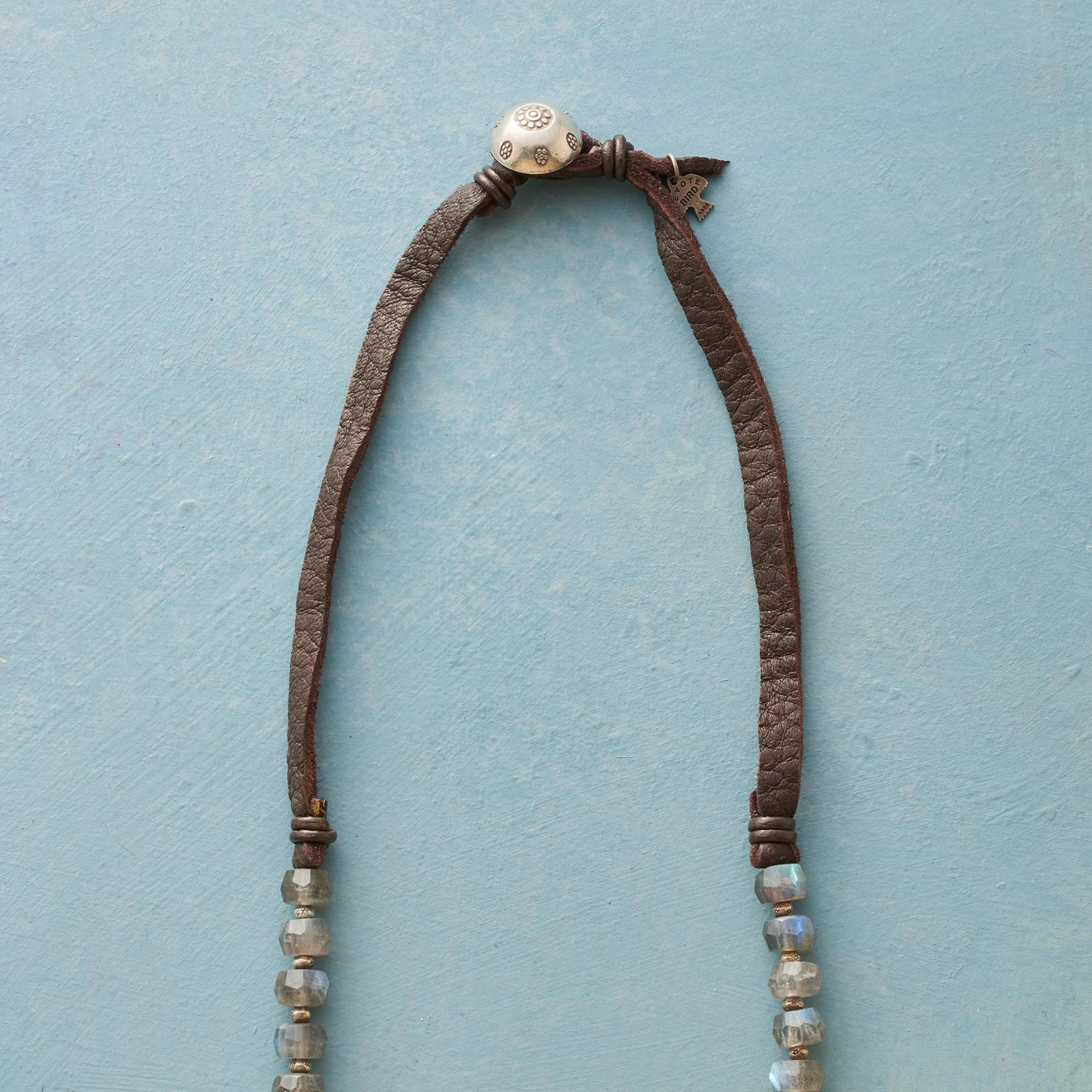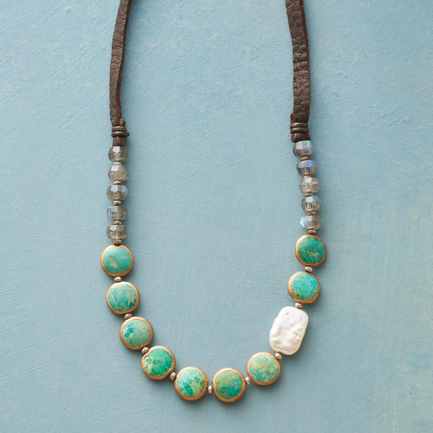 A cultured pearl brings its luminous glow to our queue of copper-wrapped turquoise. Faceted labradorite beads parade their iridescence above. Leather laces with sterling silver button and loop closure. Handcrafted. Exclusive. 18″L.
