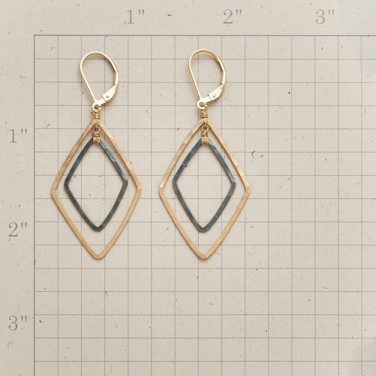 Dana Kellin suspends an oxidized sterling silver diamond-shaped loop within a 14kt gold-filled hoop. 14kt gold-filled lever back wires. Handmade in USA. 2-1/8″L.