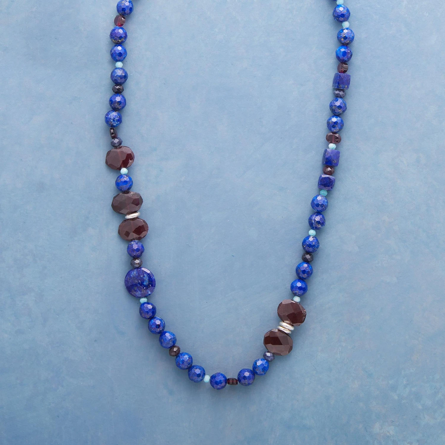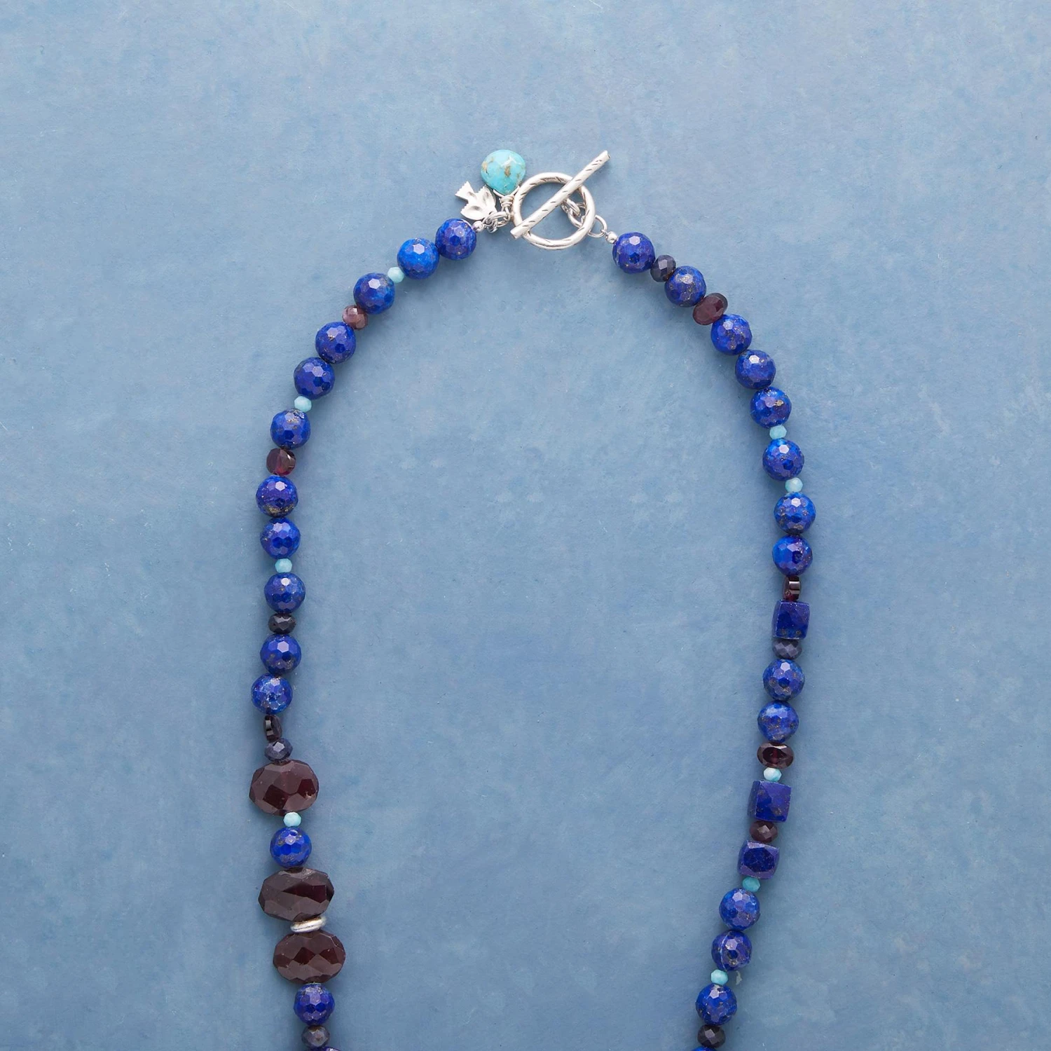 Faceted lapis, garnet, sapphire and more catch countless glints of light at every turn. Exclusive. Handmade with Thai silver toggle clasp. 18″l.