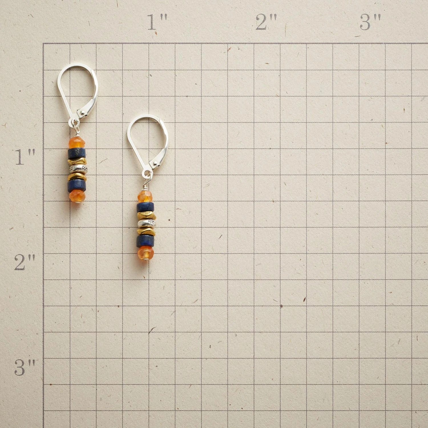Lapis heishis and carnelian rondelles in a cozy alignment with wavy brass beads and stamped sterling silver. Exclusive. Handcrafted in USA. Sterling silver lever back wires. 1-3/8″L.